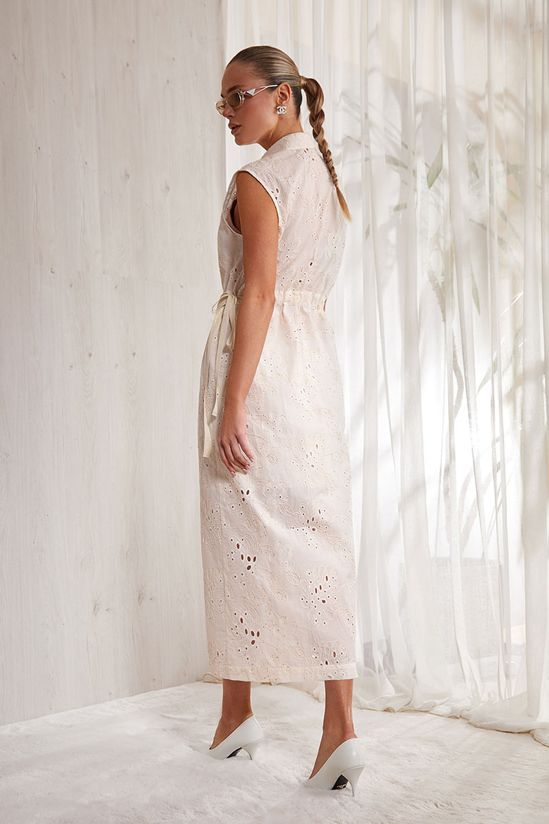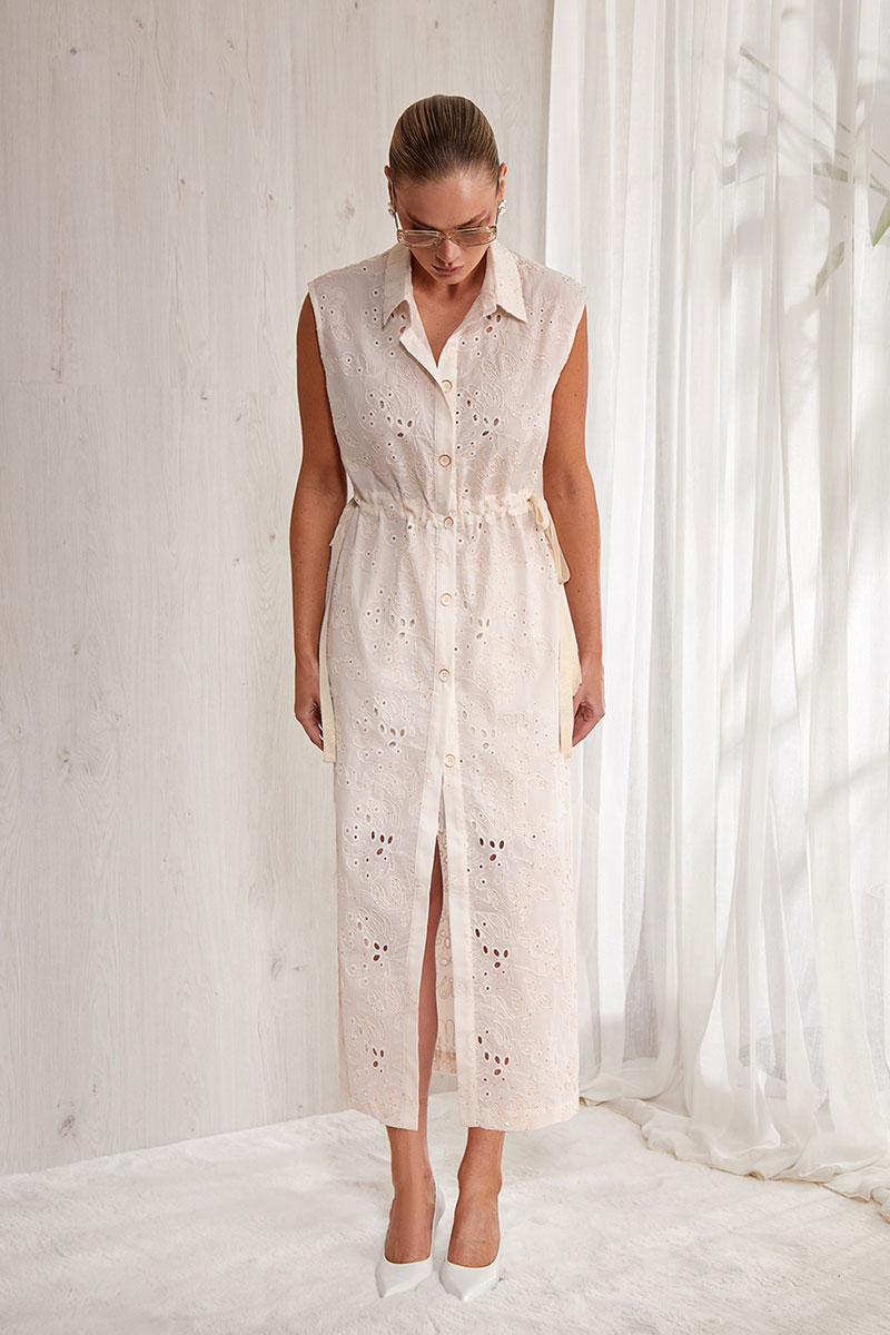 Платье прямого силуэта, выполнено из тонкого кружевного фактурного хлопка. Длина маxi. Центральная застежка на петли и пуговицы. Застежка доверху. Спинка прямая. По талии декоративная кулиса, в которую вставлена хлопковая тесьма. Изделие регулируется по линии талии. Спущенное плечо. Воротник рубашечный. Изделие частично на подкладке.