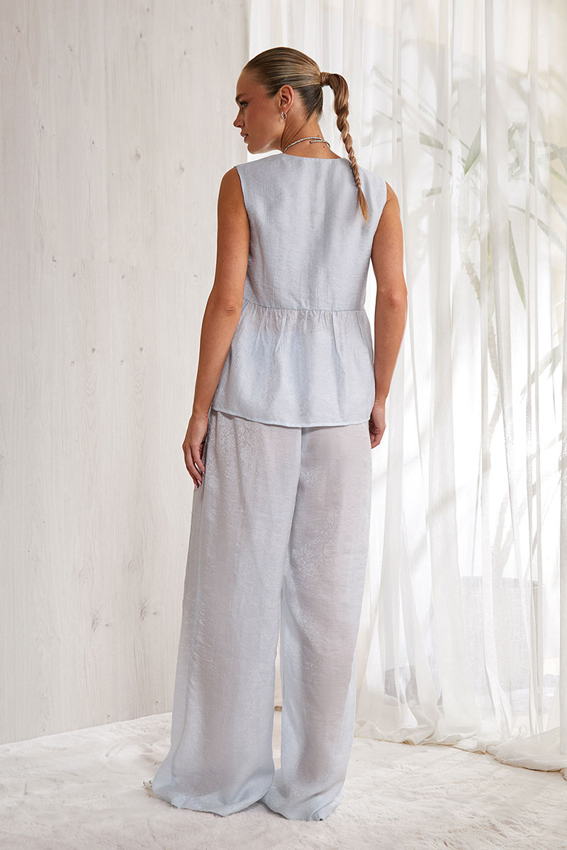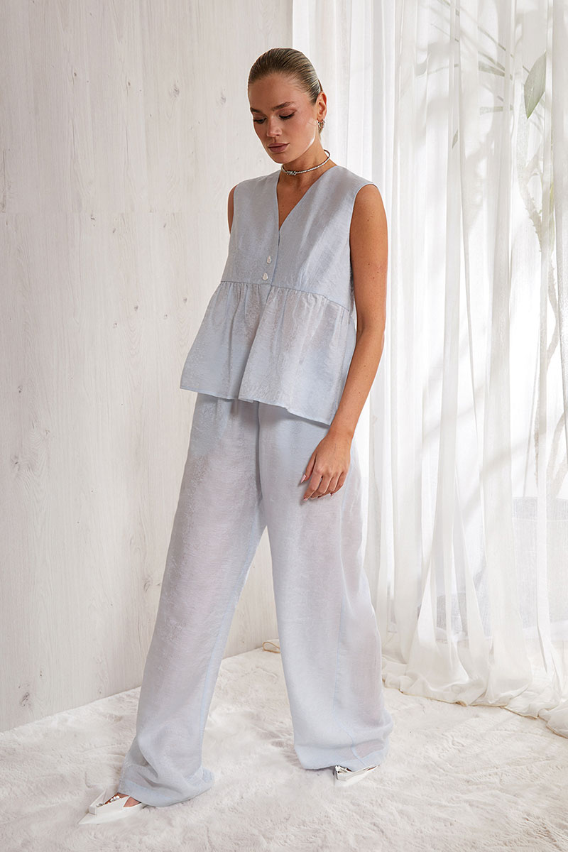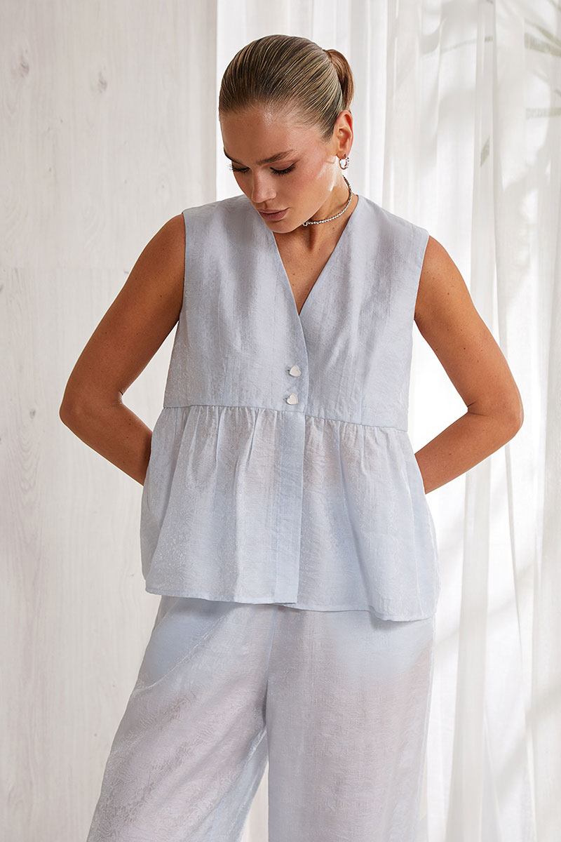 Блуза прямого силуэта. Длина изделия выше линии бедра. Центральная бортовая застежка на две декоративные пуговицы. Изделие без воротника. V-образная горловина. Блуза отрезная по линии талии. Нижняя часть изделия собрана на небольшую сборку. Изделие без рукава и без подкладки.