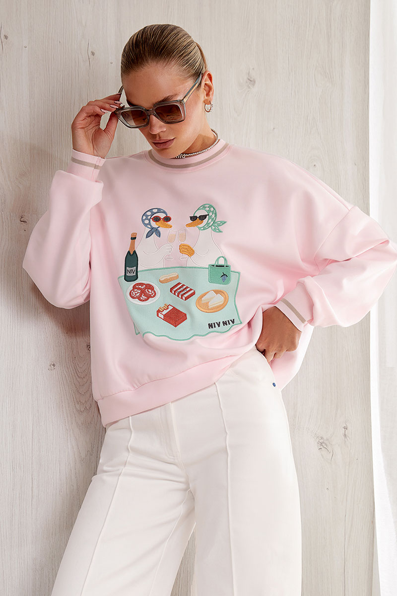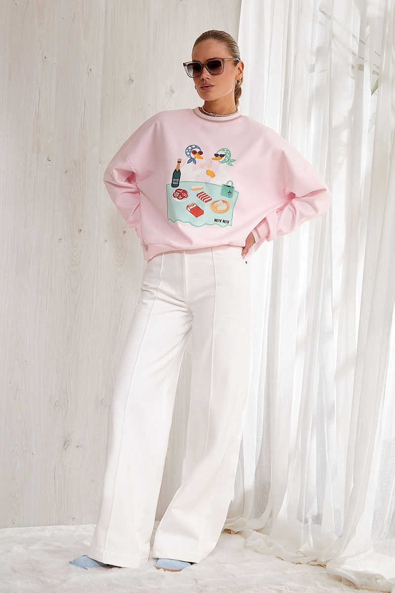 Объемный свитшот из плотного премиального трикотажного полотна(интерлок). Изделие прямое. Горловина круглая с притачной планкой из отделочной ткани. Рукав спущенный, длинный, объемный. Низ рукава на манжете из отделочной ткани. Низ изделия на планке из отделочной ткани. Перед и спинка изделия прямые. На передней половинке свитшота авторская вышивка.