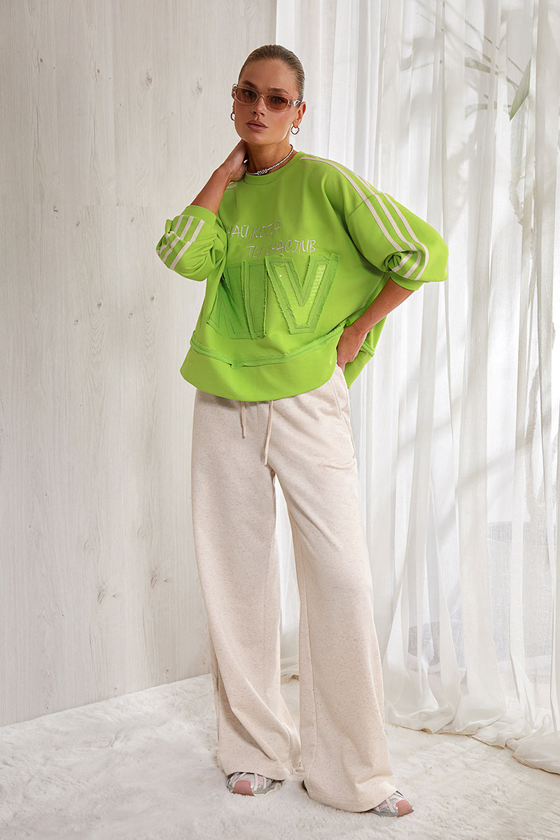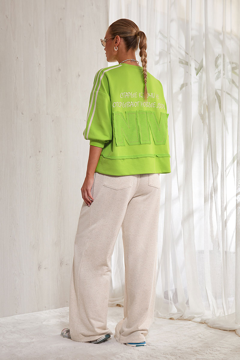 Брюки прямые, свободные. Пояс на резинке. По поясу вставлен декоративный шнурок. Карманы в боковых швах. На задних половинках брюк - накладные карманы. Авторская вышивка на полочке и на спинке свитшота.