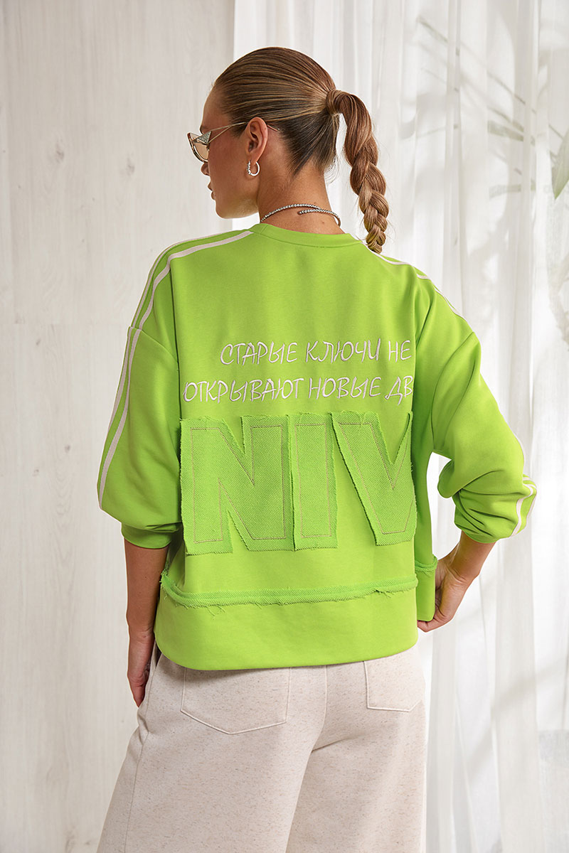 Свитшот прямого силуэта, перед и спинка изделия прямые. Спущенная линия плеча. Объемный длинный рукав. Низ рукава на притачной манжете из отделочной ткани. Горловина круглая, на притачной планке из отделочной ткани. По линии плеча настрочена декоративная тесьма.