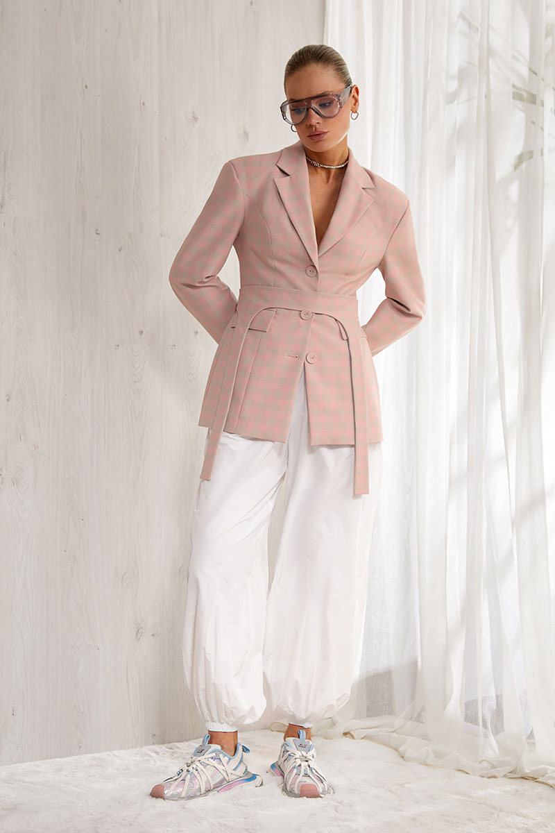 Жакет полуприлегающего силуэта, выполнен из смесовой ткани на авторской вискозной подкладке центральной бортовой застежкой на петли и пуговицы. Длина до середины бедра. Воротник пиджачного типа. На полочках рельефы и прорезные карманы в рамку с клапанами. Борта прямые. Спинка прямая со средним швом и рельефами. Усиленная, чуть удлиненная линия плеча. Втачной длинный рукав. Баска в комплекте.