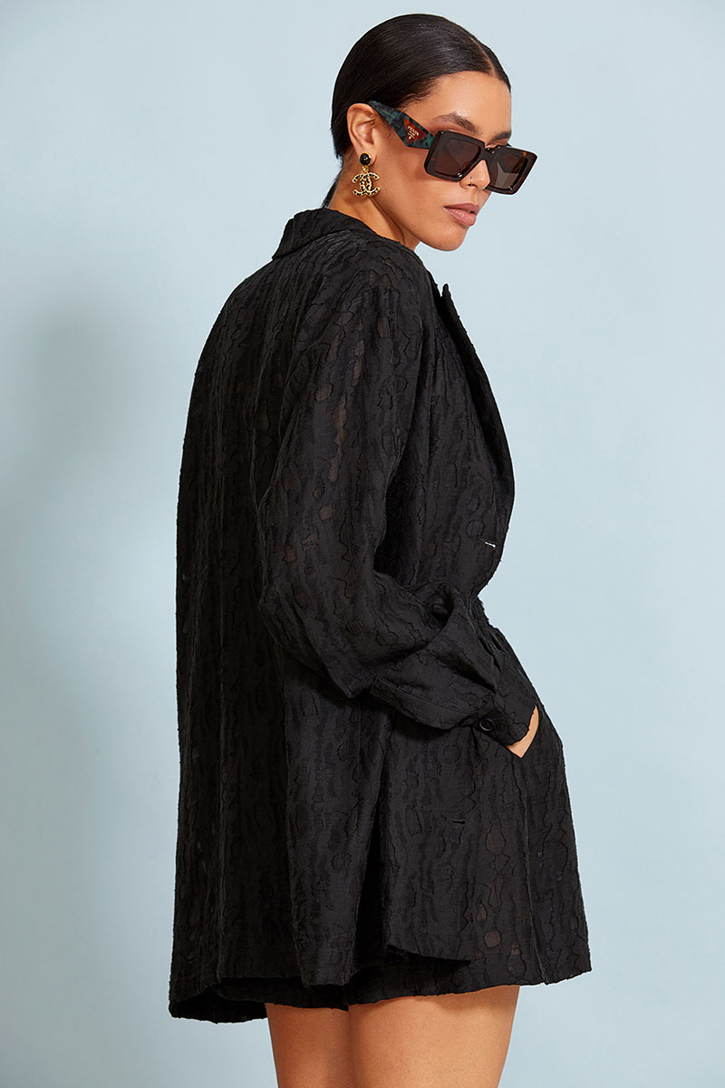 Стильный летний костюм, состоящий из блузы и шорт, выполнен из фактурного хлопка. Блуза-рубашка прямого силуэта, длиной до бедер. Центральная бортовая застежка на петли и пуговицы. Воротник пиджачного типа. Спущенная линия плеча. Полочка и спинка изделия прямые. Рубашечный длинный рукав. Низ рукава на притачной манжете. Изделие без подкладки. Шорты прямые, свободного кроя, без подкладки. Шорты на резинке (без застежки). Карманы в боковых швах.