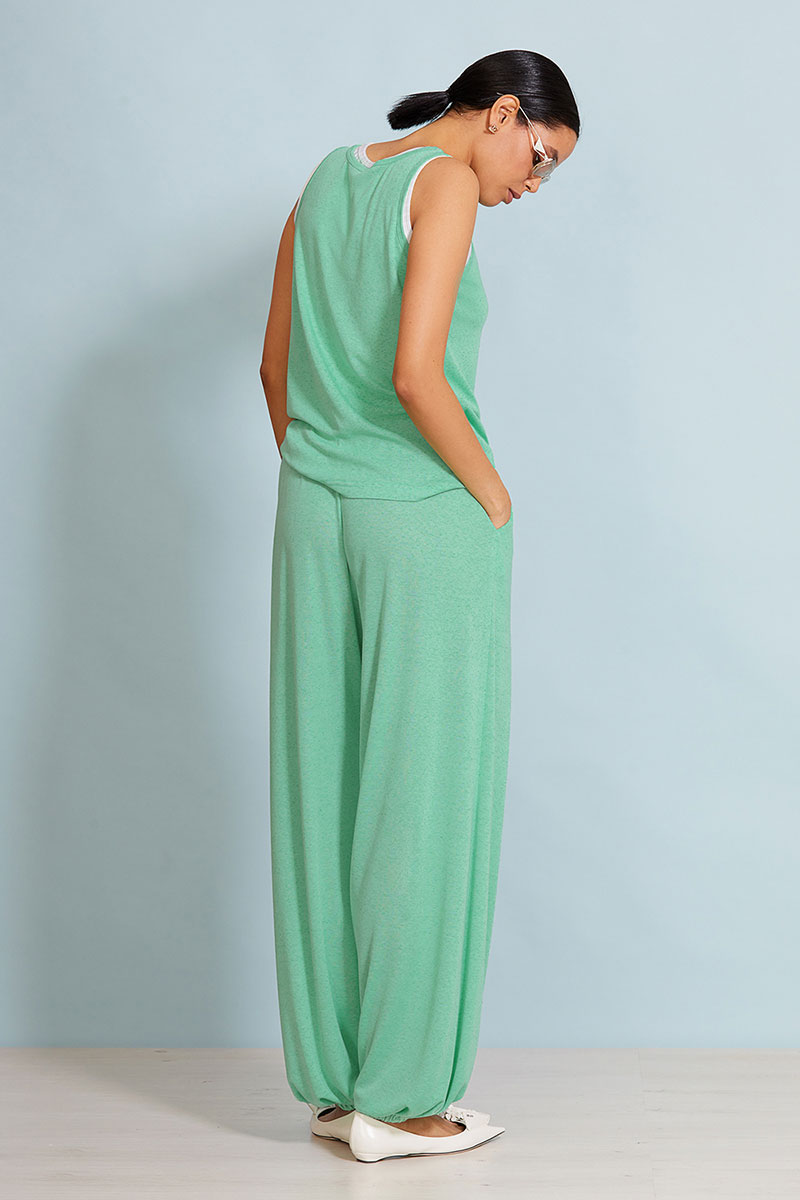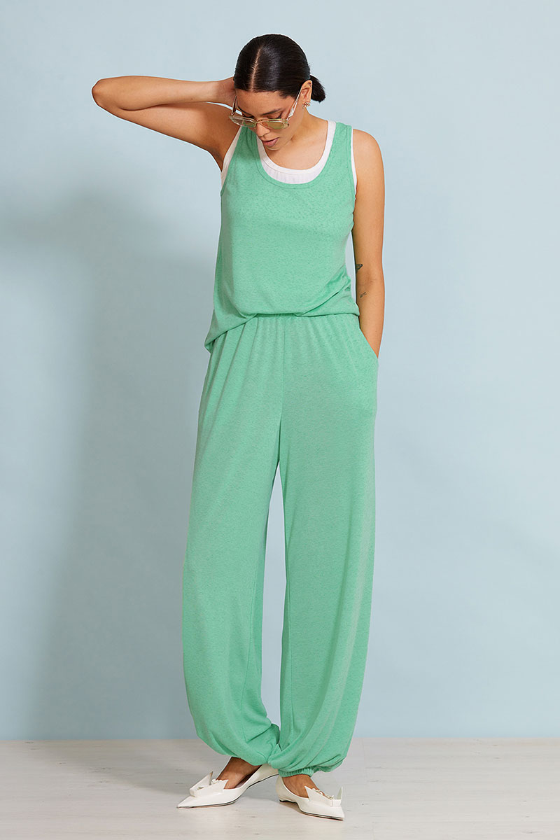 Брюки свободного кроя, прямые ,низ брюк на резинке. Пояс на резинке, карманы в боковых швах. Топ свободного кроя. Углубленная пройма, круглая горловина. Бра(второй топ) выполнено из трикотажного хлопкового полотна в широкий рубчик.
