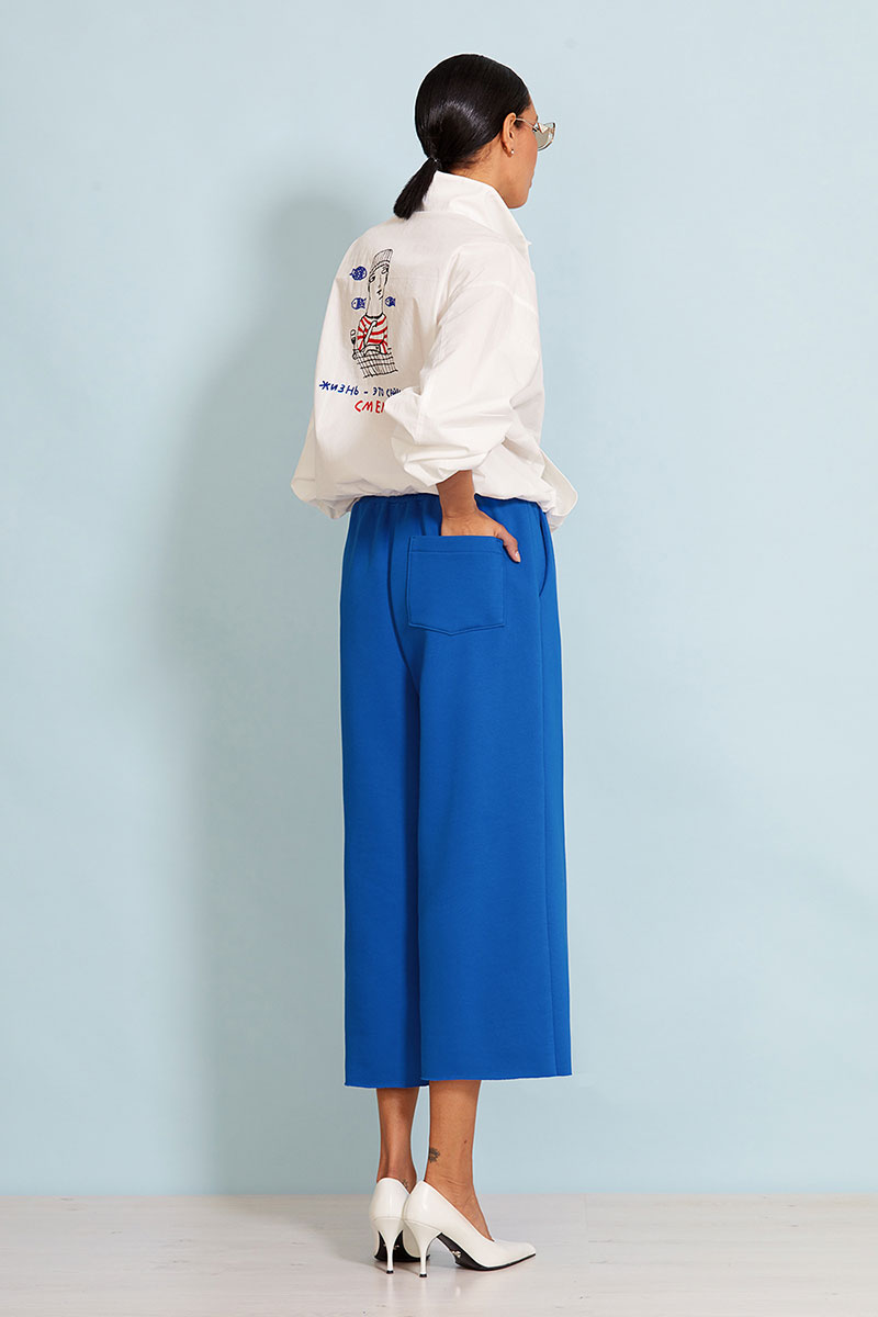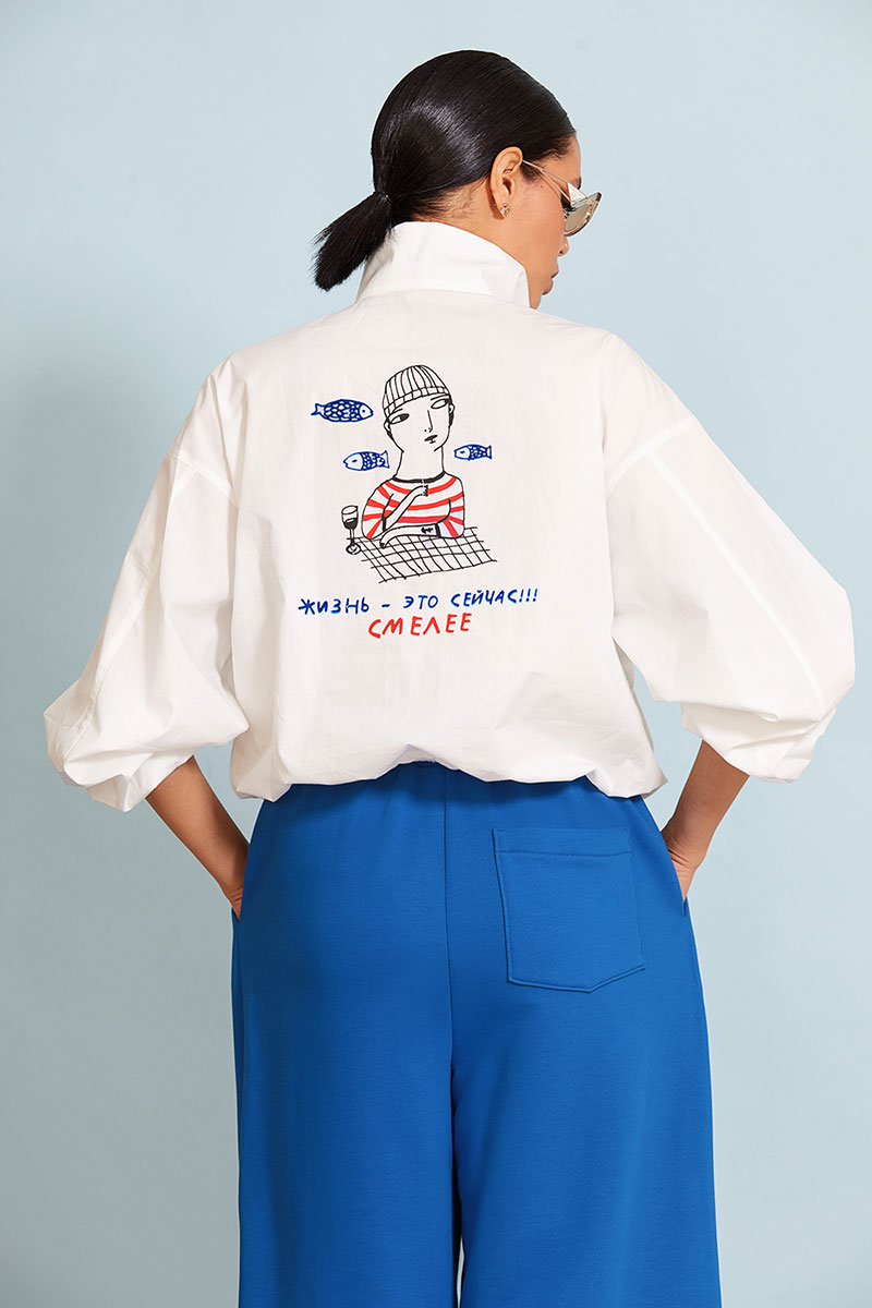 Анорак выполнен из рубашечного хлопка с эффектом “мятости”. Изделие прямое, без застежки. Перед и спинка изделия прямые. На полочке горизонтальный подрез и накладной карман-кенгуру. Спинка прямая. Спущенная линия плеча. Длинный свободный рукав. Низ рукава на резинке. Низ изделия на резинке. Широкая отрезная планка по переду, переходящая в высокую стойку. Авторский принт на спине.