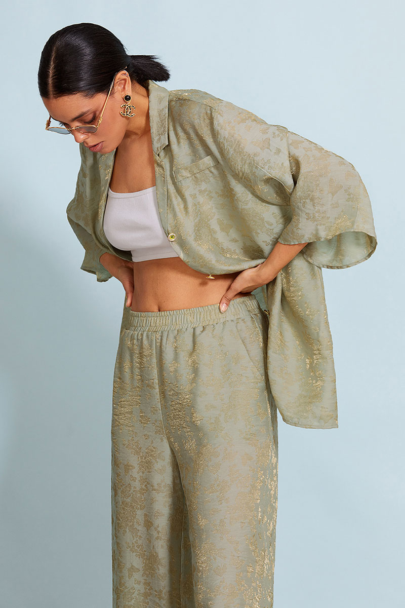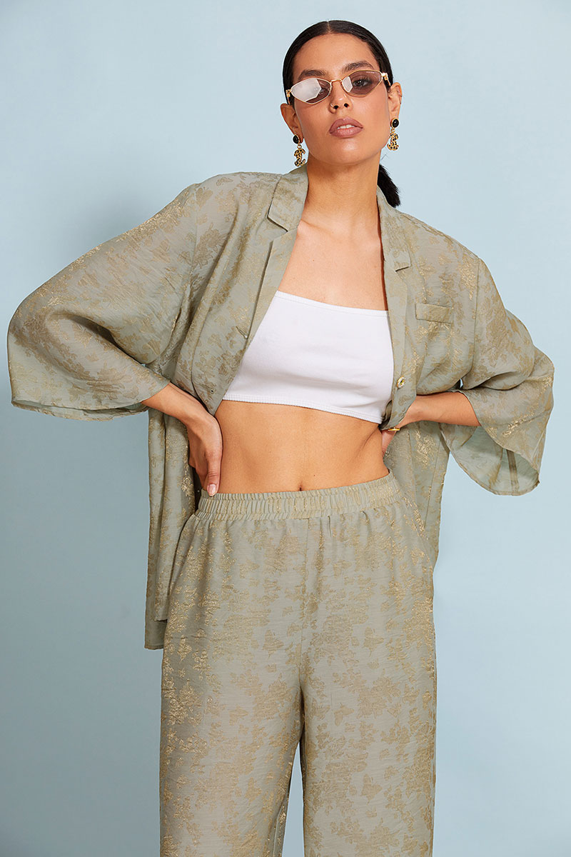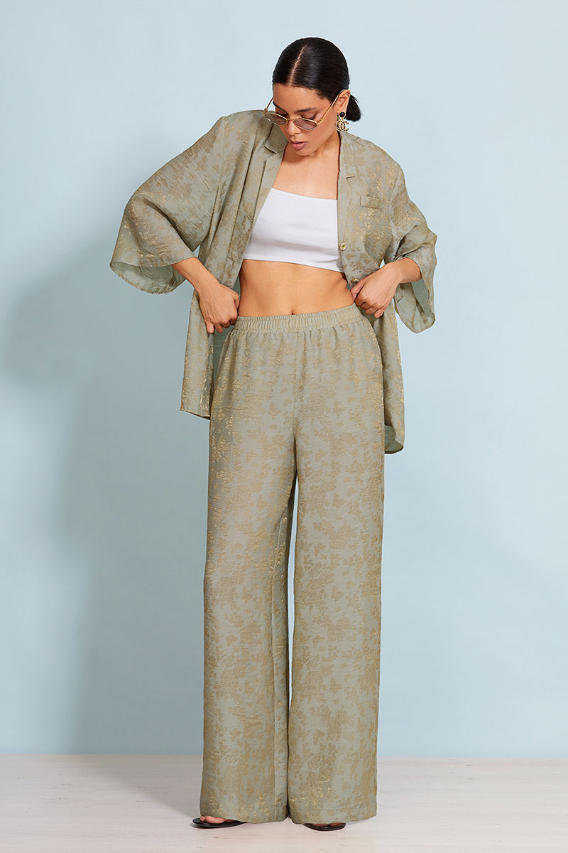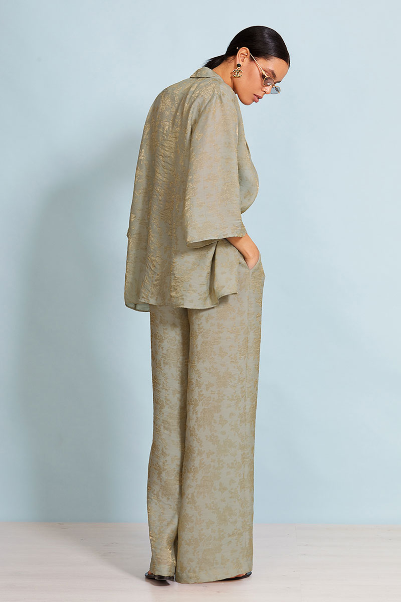 Элегантный костюм, состоящий из брюк и блузы. Блуза прямого силуэта, длиной до бедер. Центральная бортовая застежка на петли и пуговицы. Воротник рубашечный. Немного спущенная линия плеча. Свободный рукав , немного расширенный книзу.. Спинка прямая. Изделие без подкладки. Брюки прямые, свободного кроя, без подкладки. Брюки на резинке (без застежки). Карманы в боковых швах.
