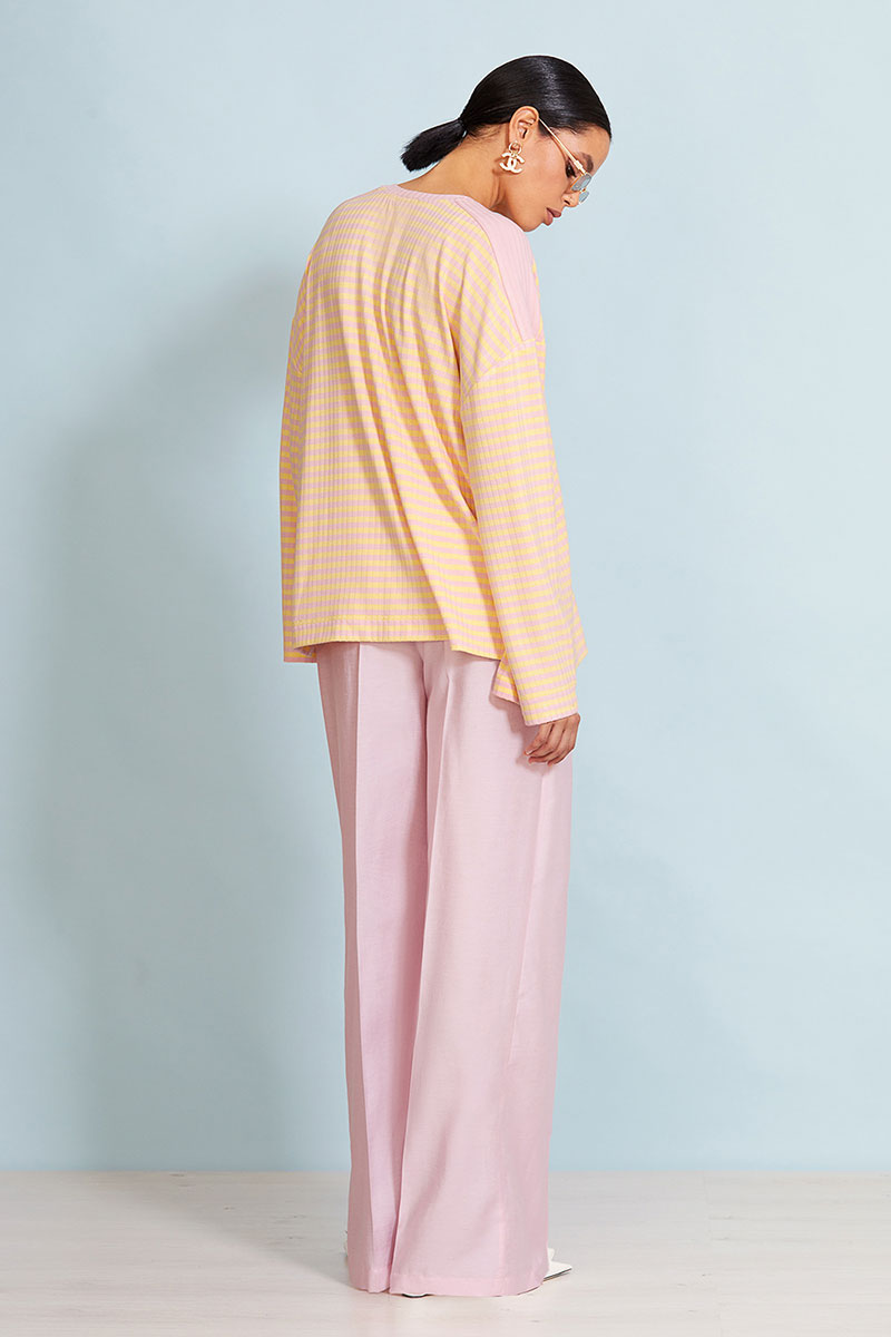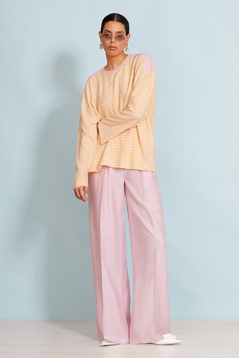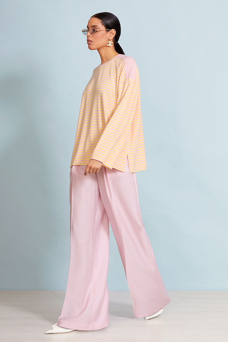 Прямые брюки-палаццо из вискозы. Брюки на поясе со шлевками. Функциональные прорезные карманы в боковых швах. Сзади прорезные карманы в рамку – обманки. По переду по две глубокие односторонние складки.