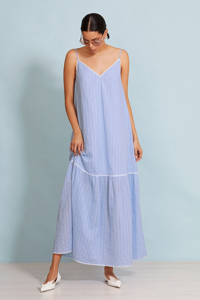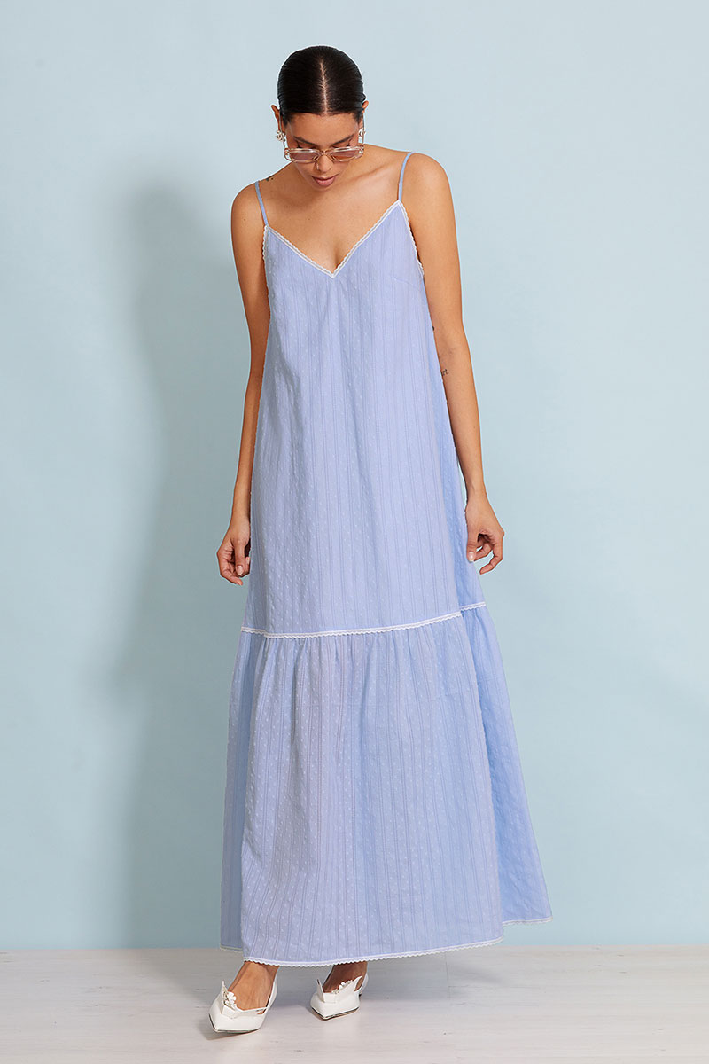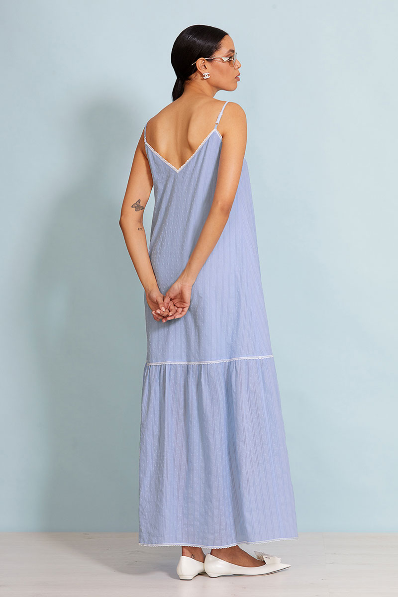 Изделие на хлопковой подкладке. Длина "Макси" (длинный/до пола). Свободное в талии и бедрах, в духе минимализма. Изделие без застежки. V-образный вырез горловины и спинки. Изделие отрезное выше линии колена. Нижняя часть платья собрана на сборку. Изделие декорировано хлопковым кружевом.