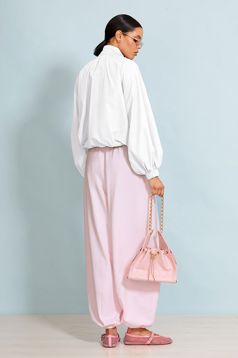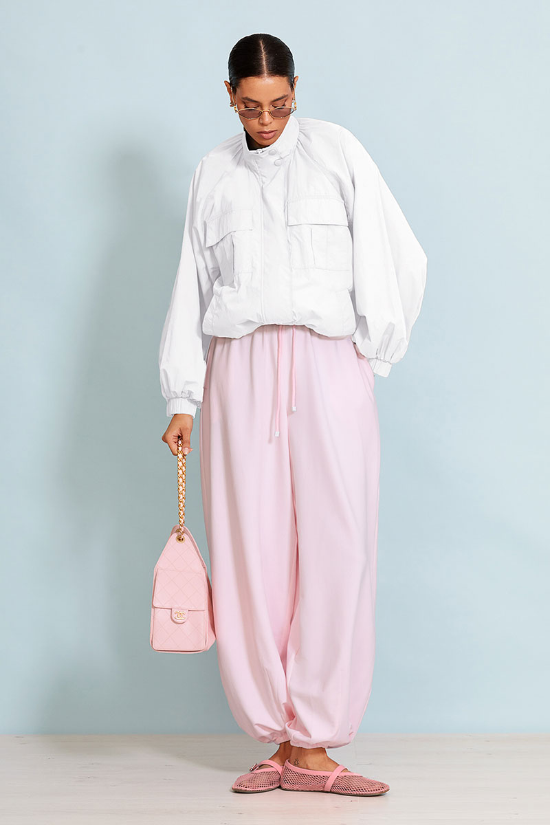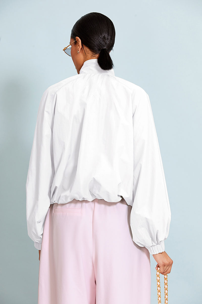 Объемная ветровка выполнена из тонкого шуршащего хлопка. Изделие на авторской вискозной подкладке. Центральная бортовая застежка на молнию, которая дополнительно закрывается притачной планкой. Перед и спинка изделия прямые. На передних половинках изделия накладные карманы-портфели с клапанами и прорезные карманы с листочками. Рукав реглан. Длинный объемный рукав. Низ рукава на резинке. Низ изделия на резинке. Горловина-стойка. На спинке авторская термоапликация.