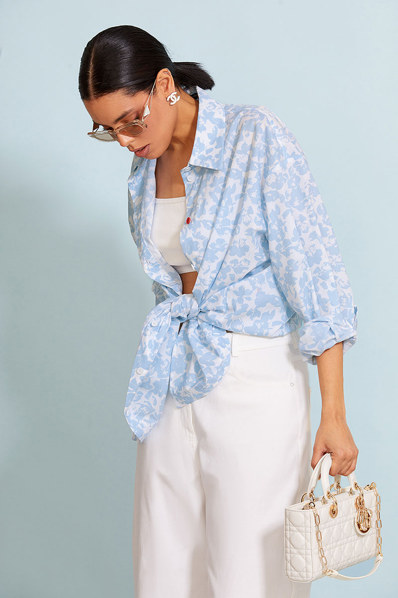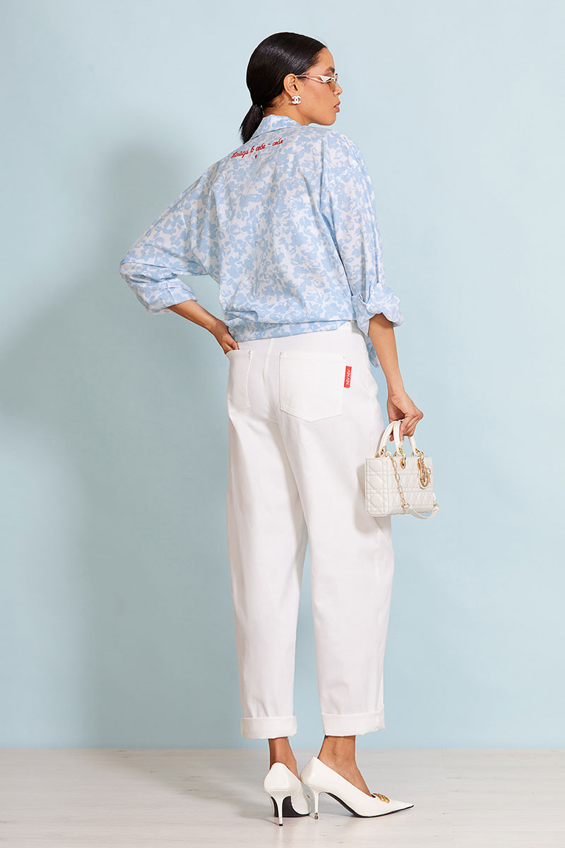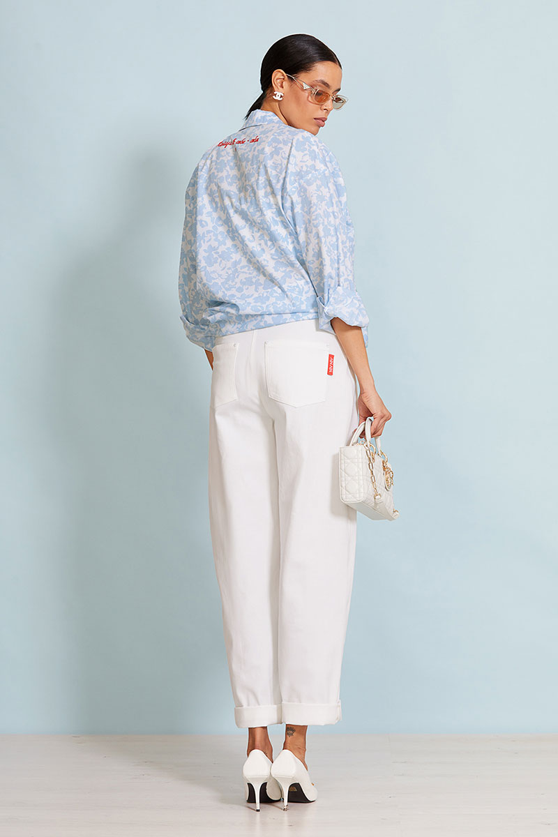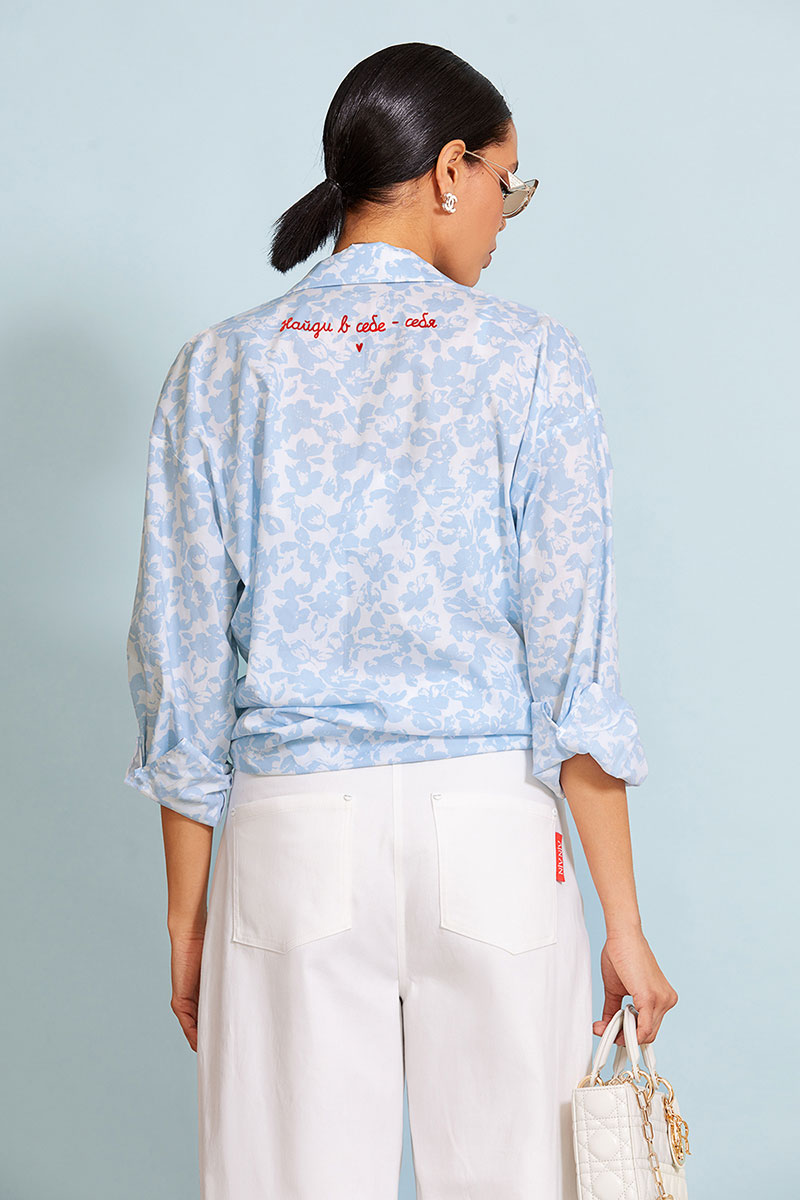 Стильная удлиненная рубашка прямого силуэта длиной до бедра. Центральная застежка доверху на петли и пуговицы. Перед и спинка изделия прямые. Спущенная линия плеча, объемный рубашечный рукав. Рукав на притачной манжете. Спинка с отрезной кокеткой. Рубашечный воротник на стойке. Авторский принт на спинке изделия.