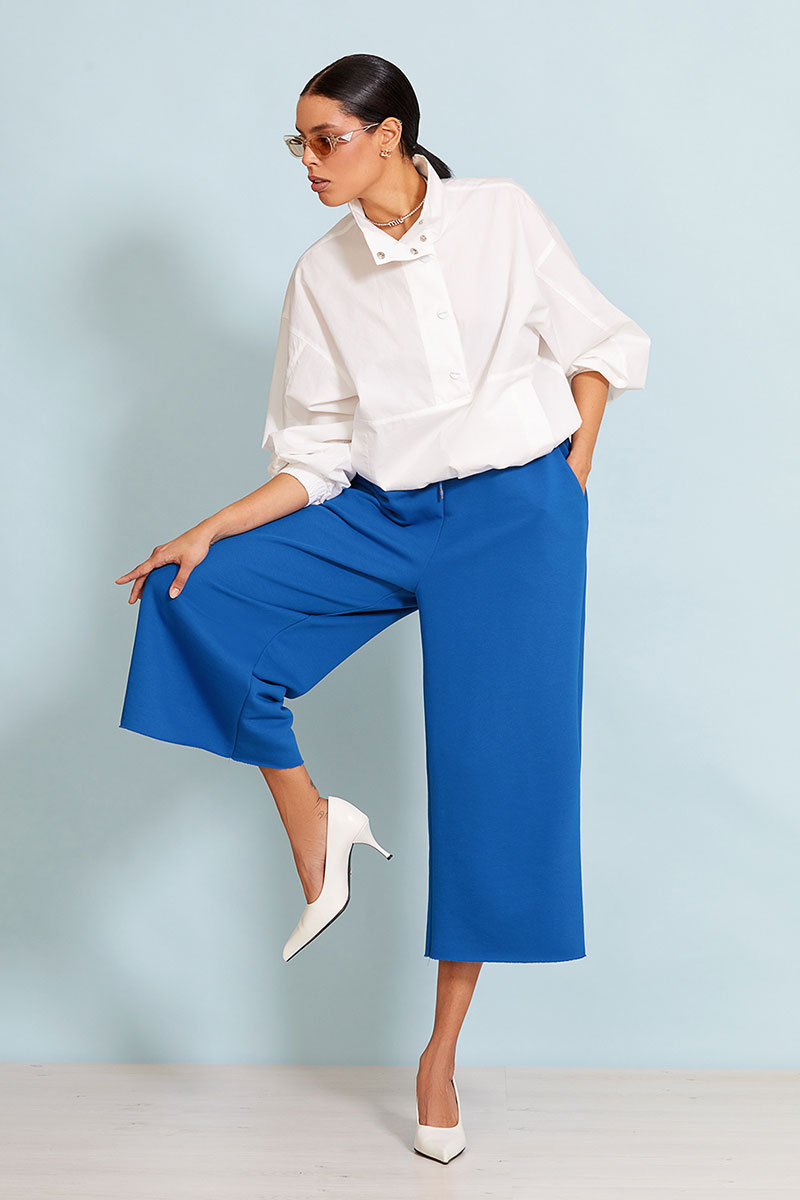Шорты- бермуды выполнены из премиального трикотажного полотна. Шорты свободного кроя, длина ниже колена, пояс на резинке. Карманы в боковых швах. Сзади накладной карман. По поясу вставлен декоративный шнурок.