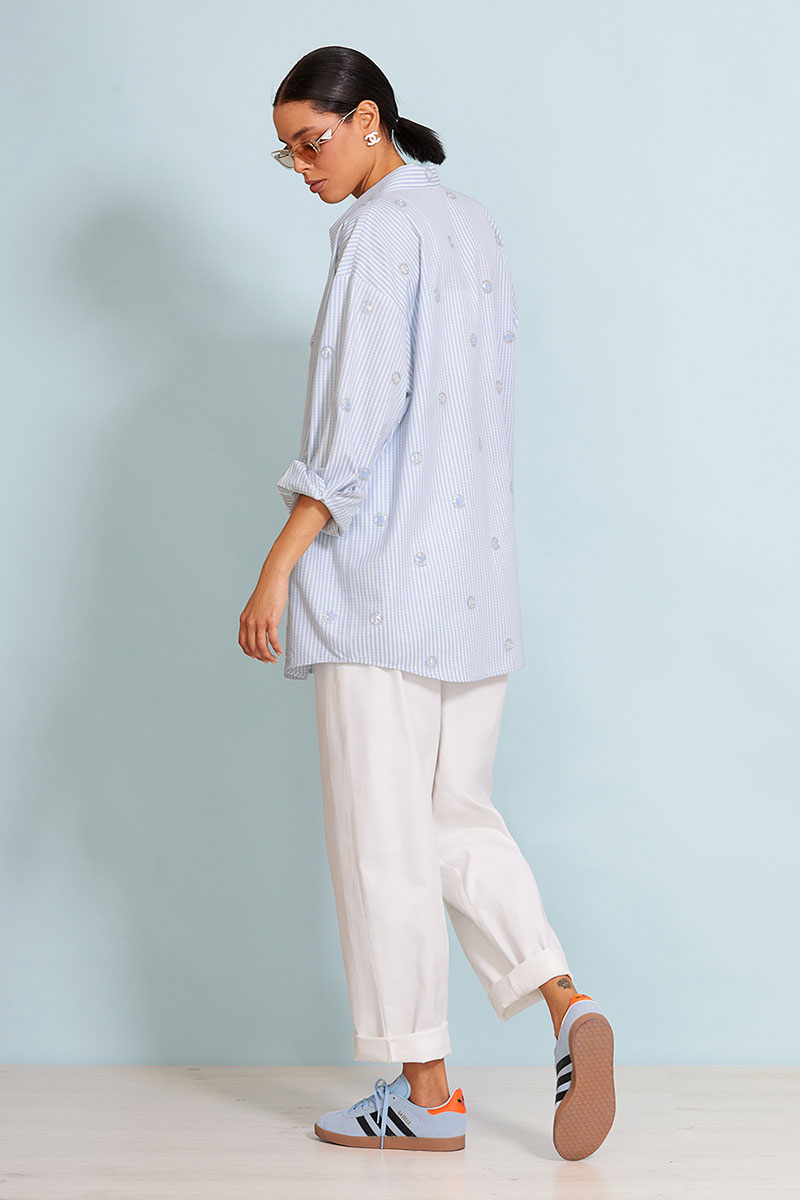 Удлиненная рубашка прямого силуэта длиной ниже середины бедра, выполнена из премиального хлопка с вышивкой. Центральная застежка доверху на петли и пуговицы. Спущенная линия плеча, объемный рубашечный рукав. Рукав на притачной манжете. Спинка прямая. Рубашечный воротник на стойке.
