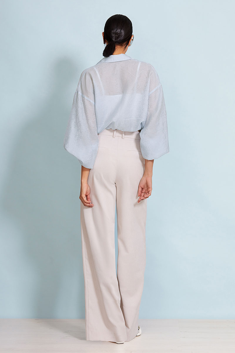 Изделие длиной до линии талии без застежки. Низ блузы на кулисе, в которую вставлен шнурок. Перед и спинка изделия прямые. Спущенная линия плеча. Рукав длинный объемный. Низ рукава на резинке.