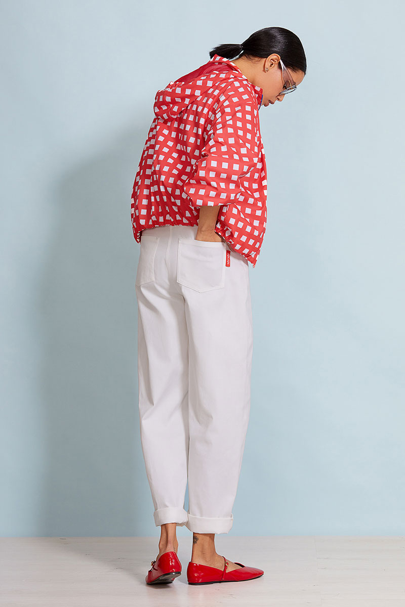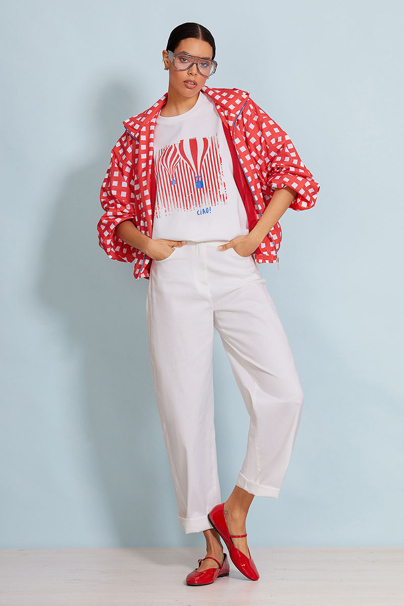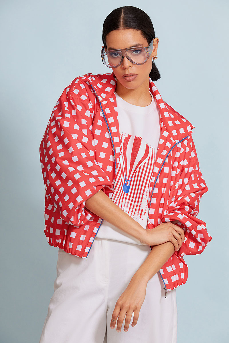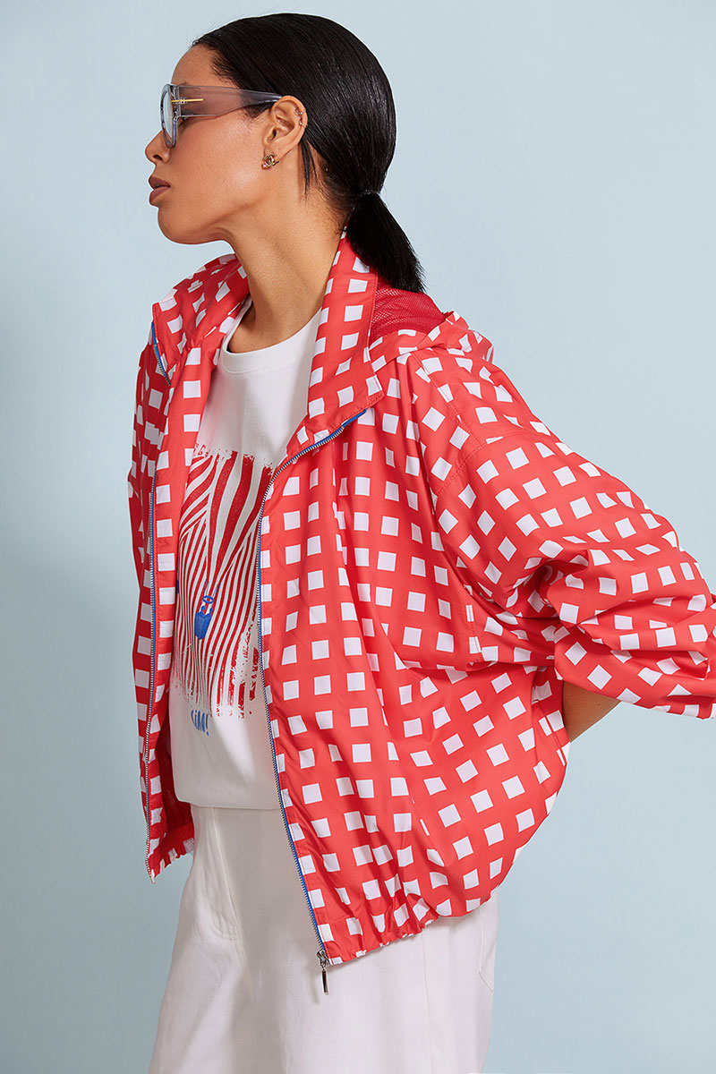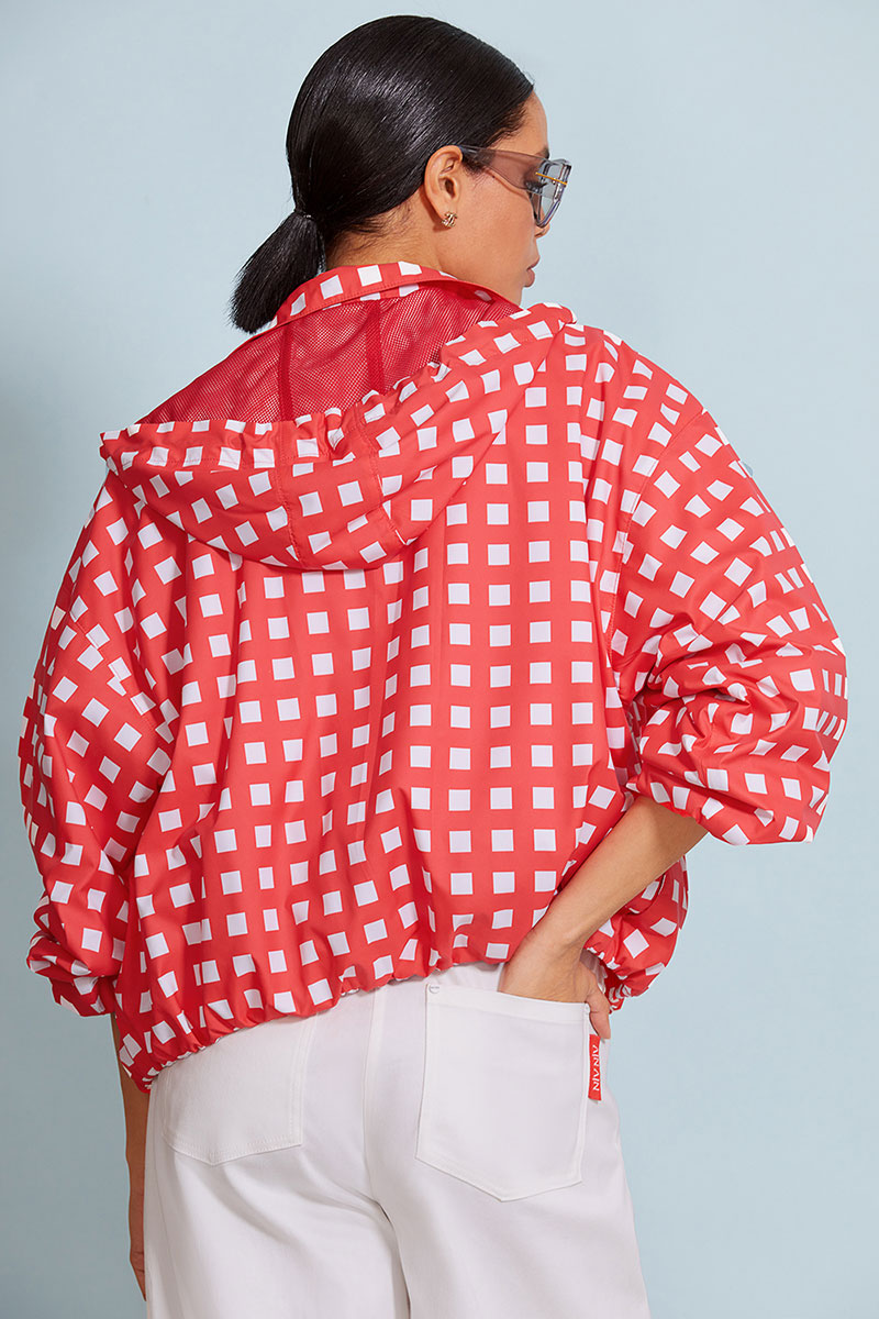 Ветровка выполнена из тонкой плащевой ткани в клетку. Изделие на подкладке-сетке. Центральная застежка на молнию. Спущенная линия плеча. Длинный объемный рукав. Низ рукава на резинке. Низ изделия на резинке. Горловина-стойка с притачным капюшоном.