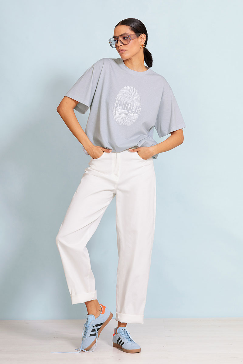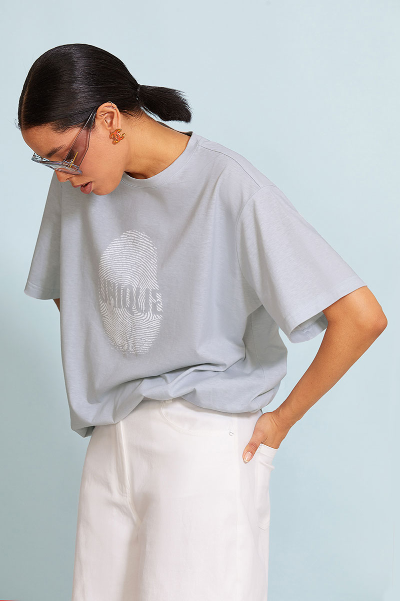 Объемная футболка "Оверсайз" (свободный/объемный крой) выполнена из тонкого меланжевого   хлопка. Спущенная линия  плеча. Рукав до локтя. Горловина круглая  с притачной планкой.   Дизайнерский принт “ Отпечаток” на передней половинке футболки.
