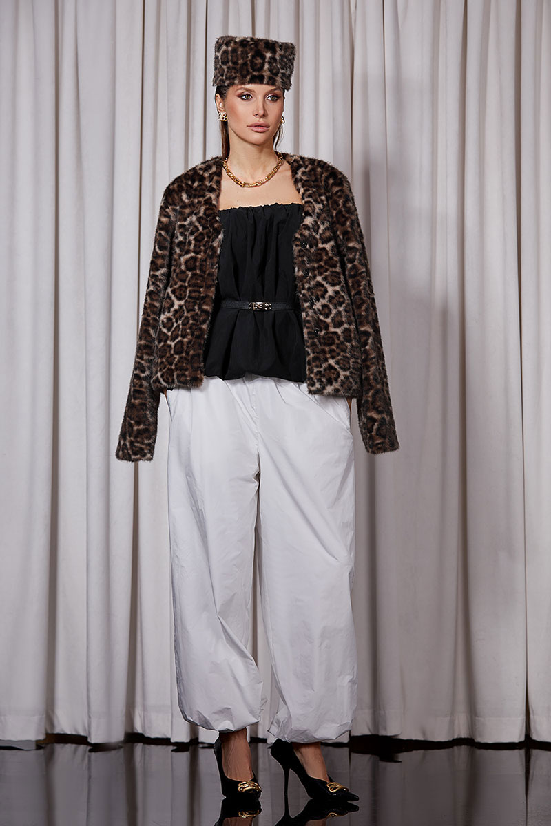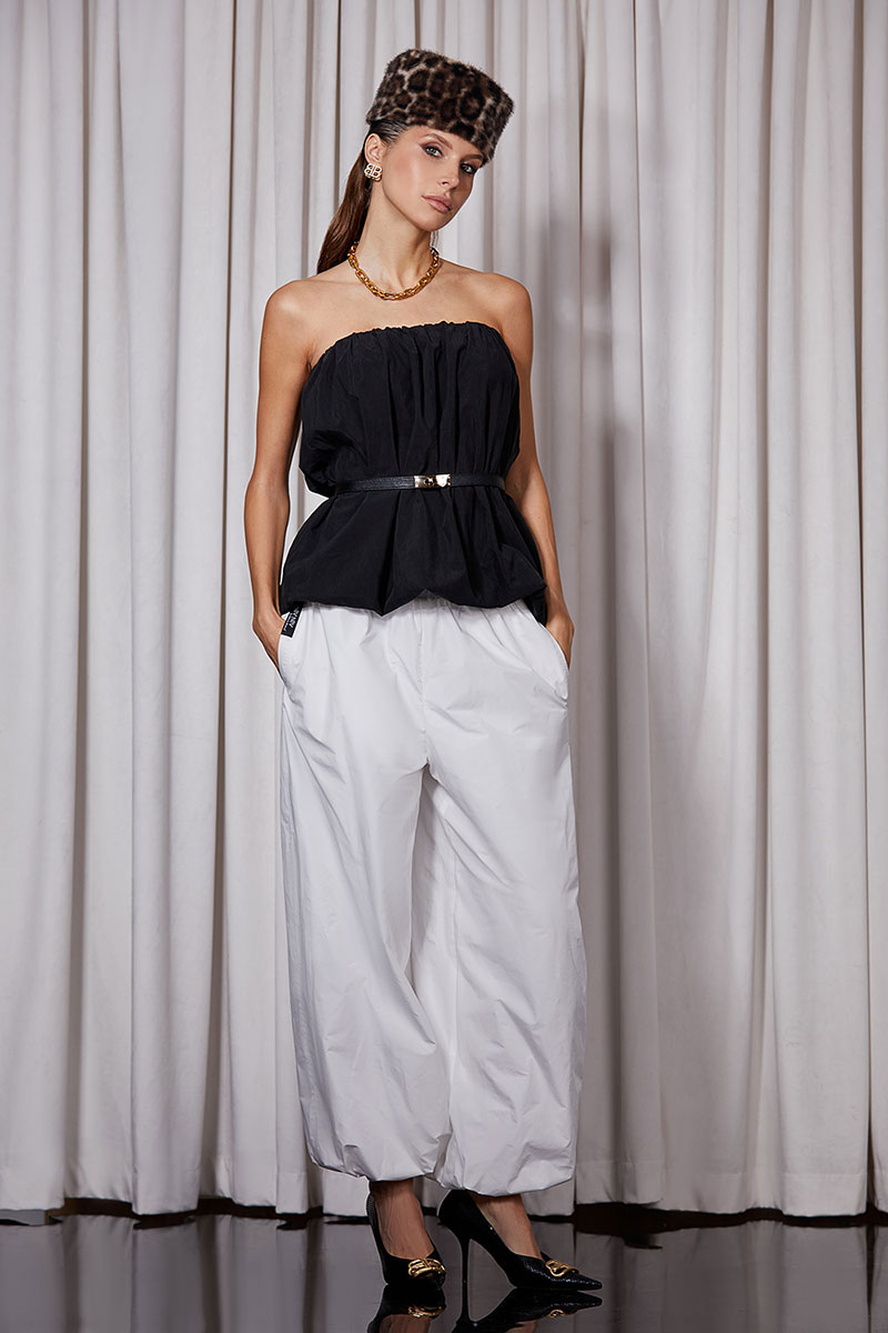 Брюки-“Алладины” выполнены из шуршащего хлопка.Брюки полностью на подкладке. Изделие на поясе, в который вставлена резинка. Низ брюк так же на резинке. Карманы в боковых швах. По боковому шву декоративный флажок.