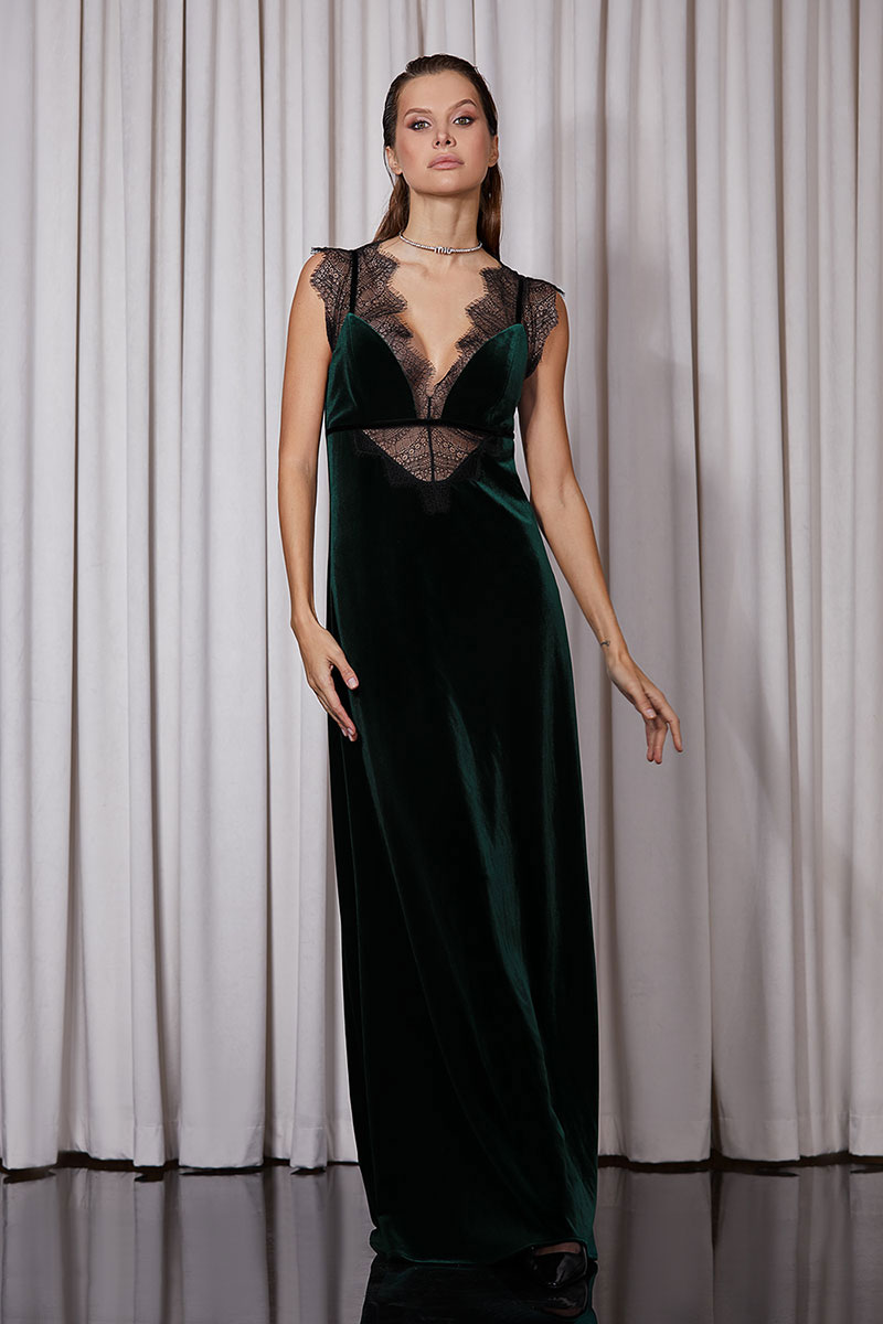 Изящное платье из бархата. Длина Midi. Платье полуприлегающего силуэта в пол. Спереди и сзади декорировано французским кружевом. Сбоку потайная молния.