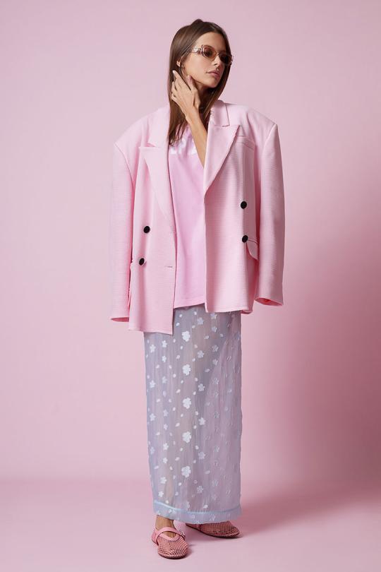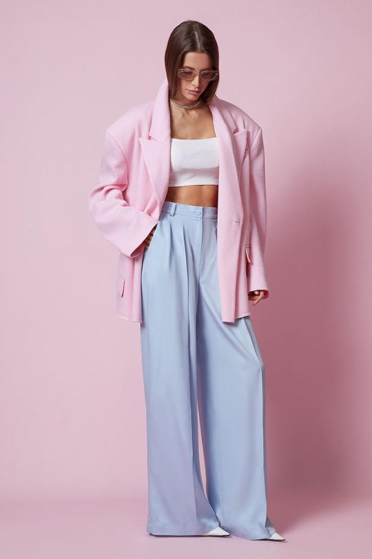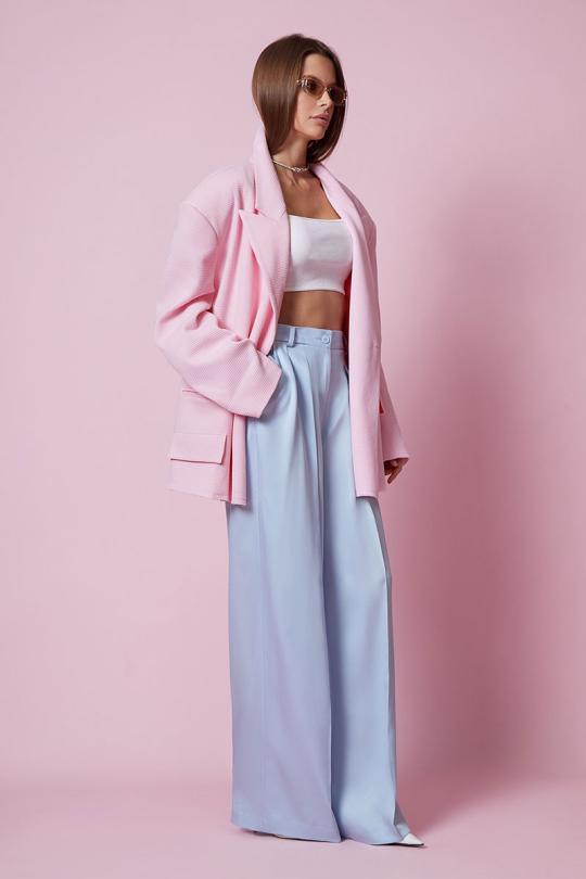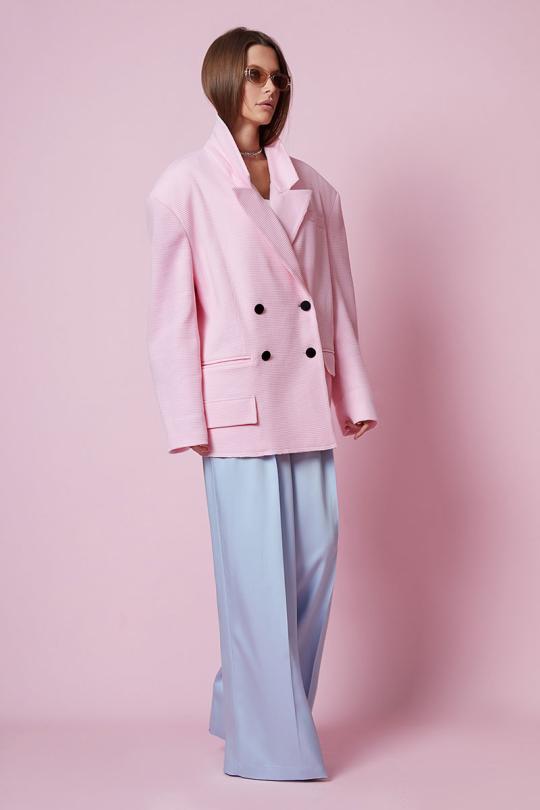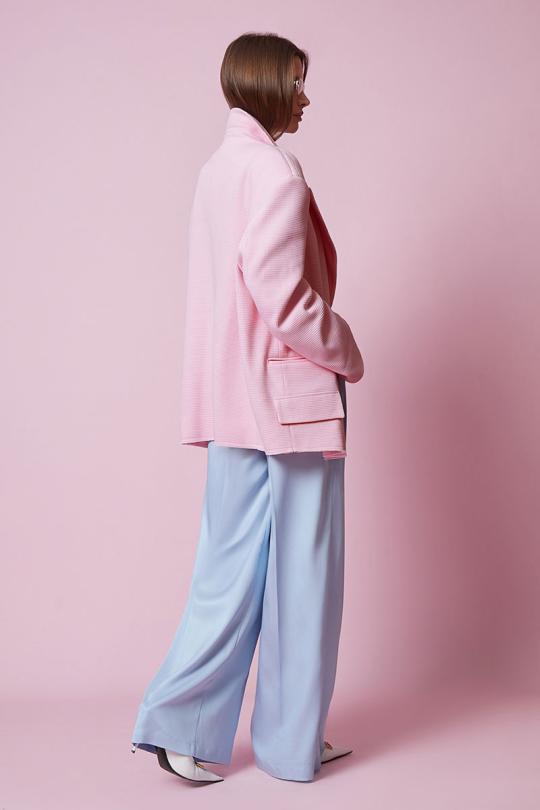 Жакет прямого силуэта, выполнен из смесовой ткани на авторской вискозной подкладке. Жакет прямой, выполнен по типу “мужской пиджак”. Усиленное удлиненное плечо. Изделие с двубортной застежкой на 4 петли и пуговицы. Воротник пиджачного типа. На полочках нагрудные вытачки, прорезные карманы в рамку и клапаны, декоративный прорезной карман с листочкой на верхней левой полке жакета. Борта прямые. Спинка прямая. Рукав втачной двухшовный. Низ рукава со шлицей. По низу рукава и низу изделия необработанный край.