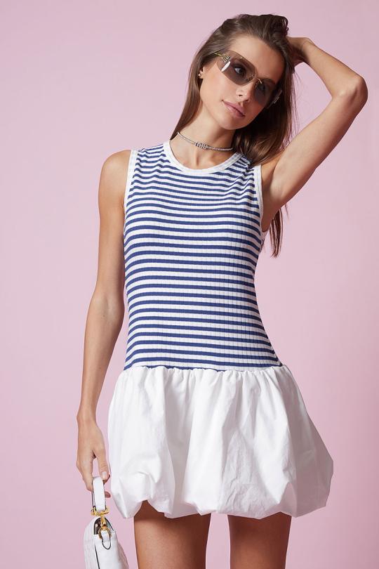 Стильное мини платье, выполнено из вискозного трикотажного полотна в полоску. Перед и спинка изделия прямые. Горловина круглая с притачной планкой из отделочной ткани. Низ платья выполнен из тонкого хлопка. Проймы обработаны отделочной тканью.