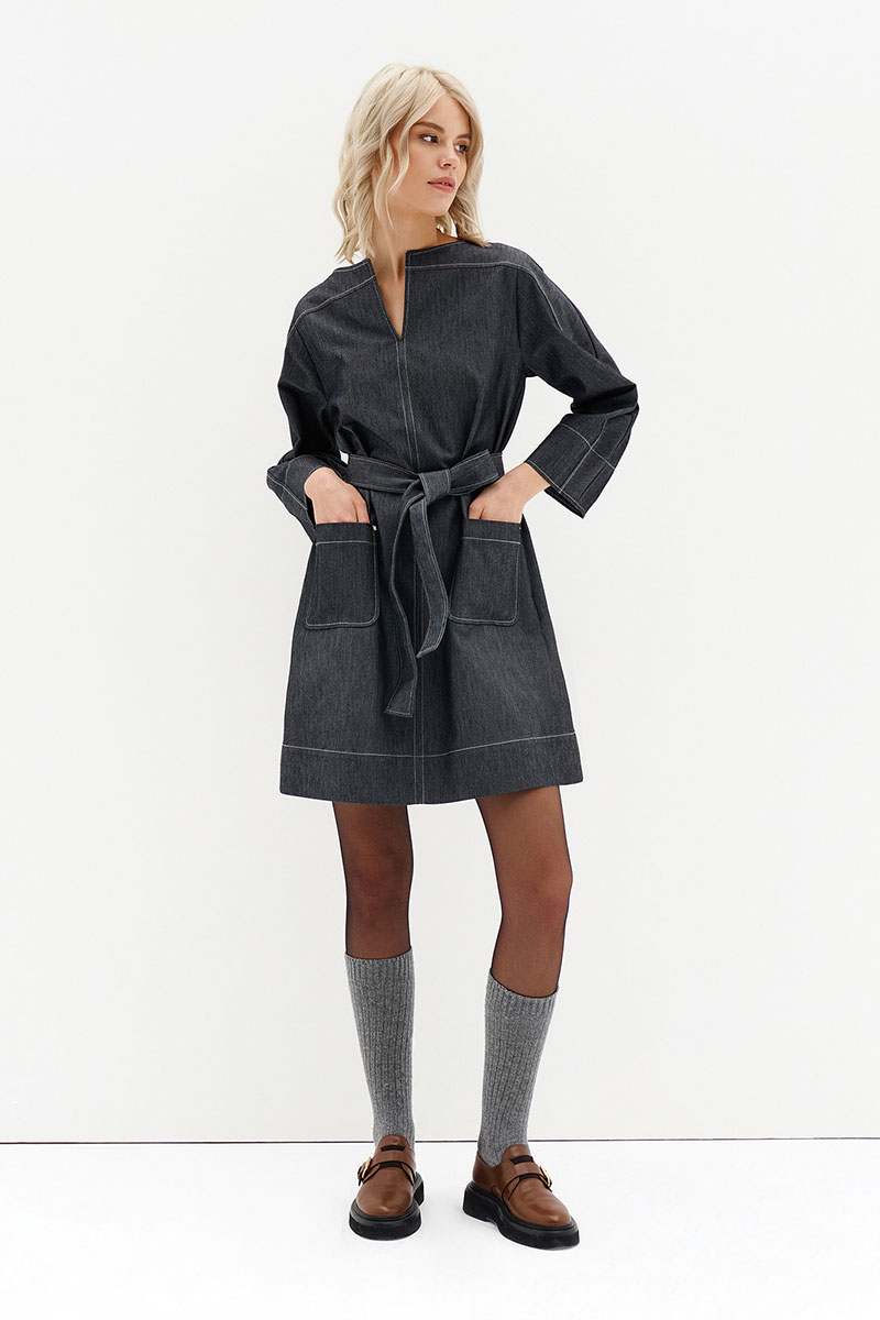 Джинсовое платье с поясом.