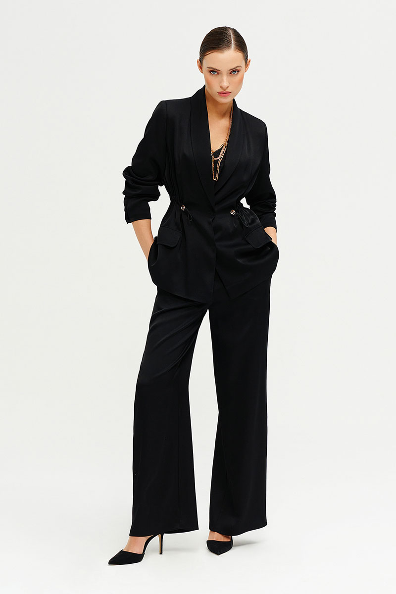Брюки прямого кроя с карманами, на поясе из струщегося вискозного полотна средней плотности.