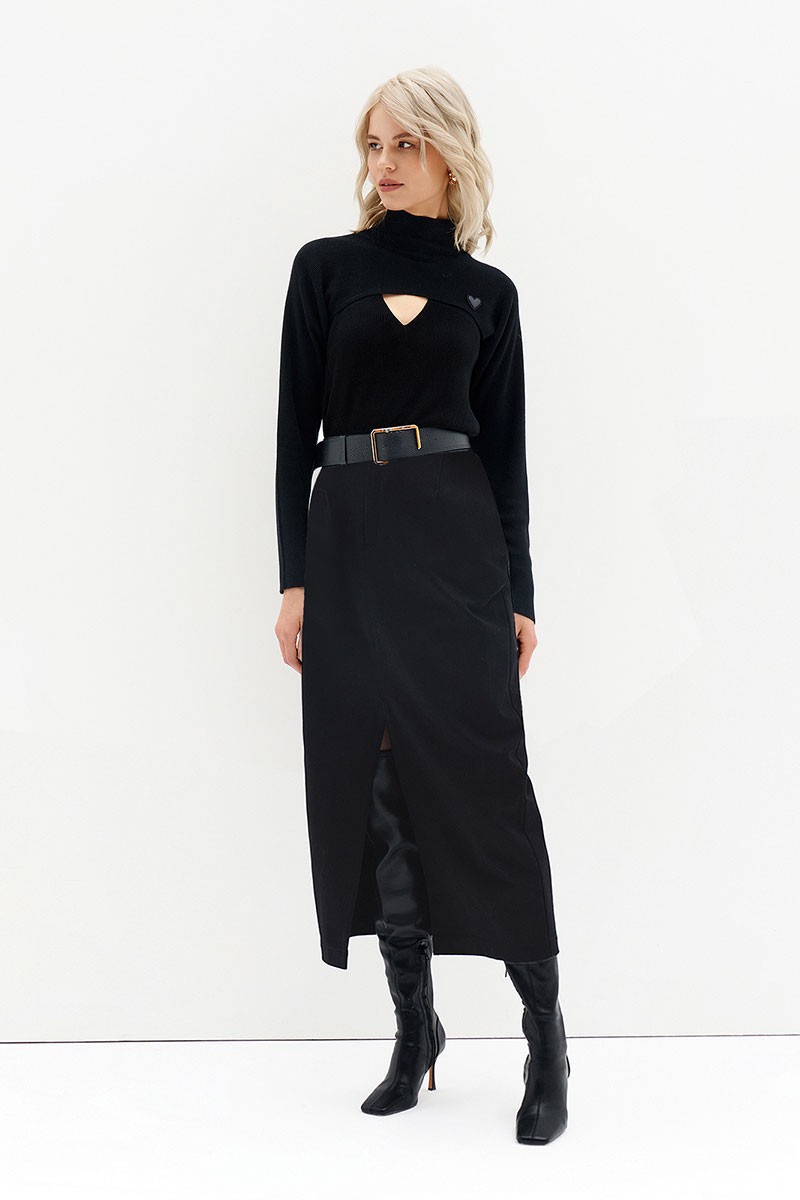 Комплект из оригинальной блузки и базовой юбки. Блузка из 2 предметов - базовая и рукава с воротником-стойкой. Комфортная юбка актуального кроя, без ремня.