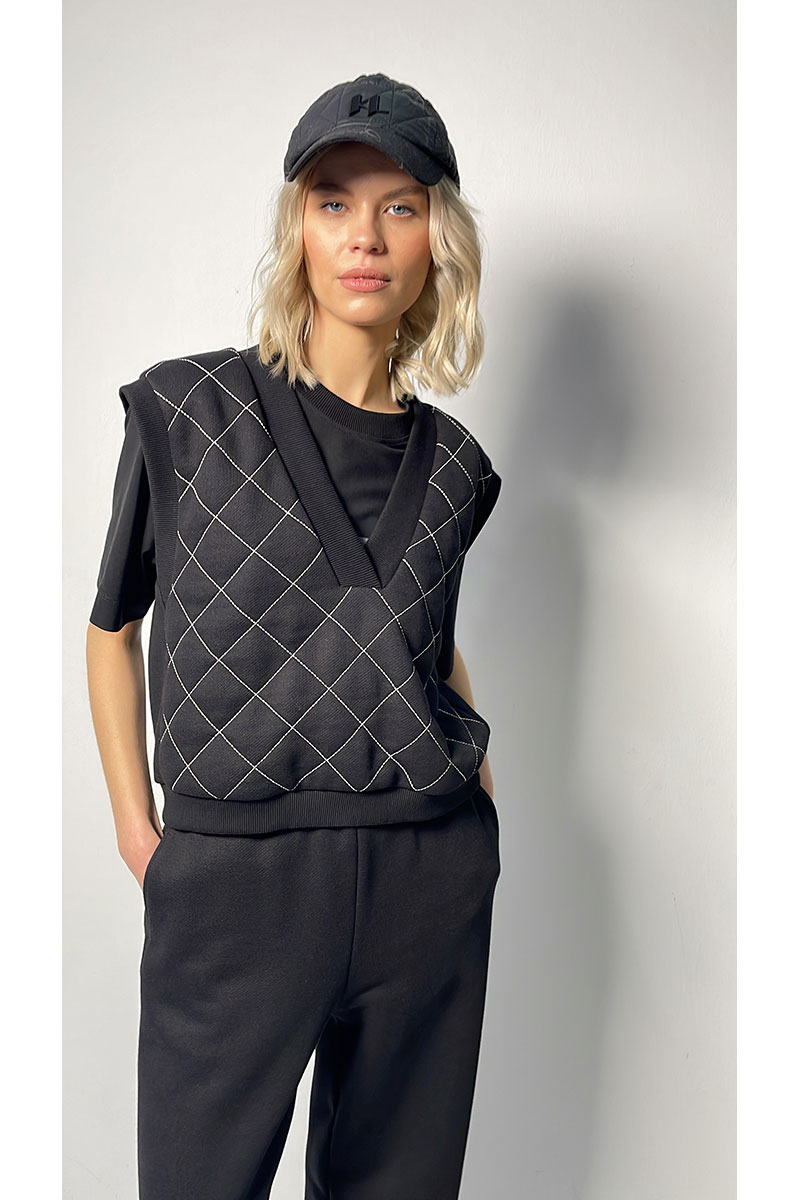 Трикотажный комплект из стильного жилета с оригинальной контрастной стежкой и актуальных базовых брюк на резинке.