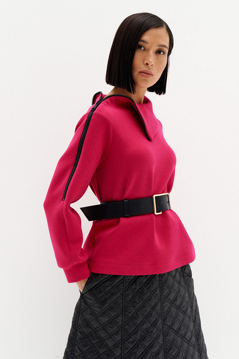 Блуза имеет функциональную молнию по плечу, степень застегивания молнии дает возможность создавать разные силуэты. Строгий с высоким воротом, или более расслабленный со спущенной горловиной. Можно носить как в заправленом виде под юбочные луки, или навыпуск под брючные образы.