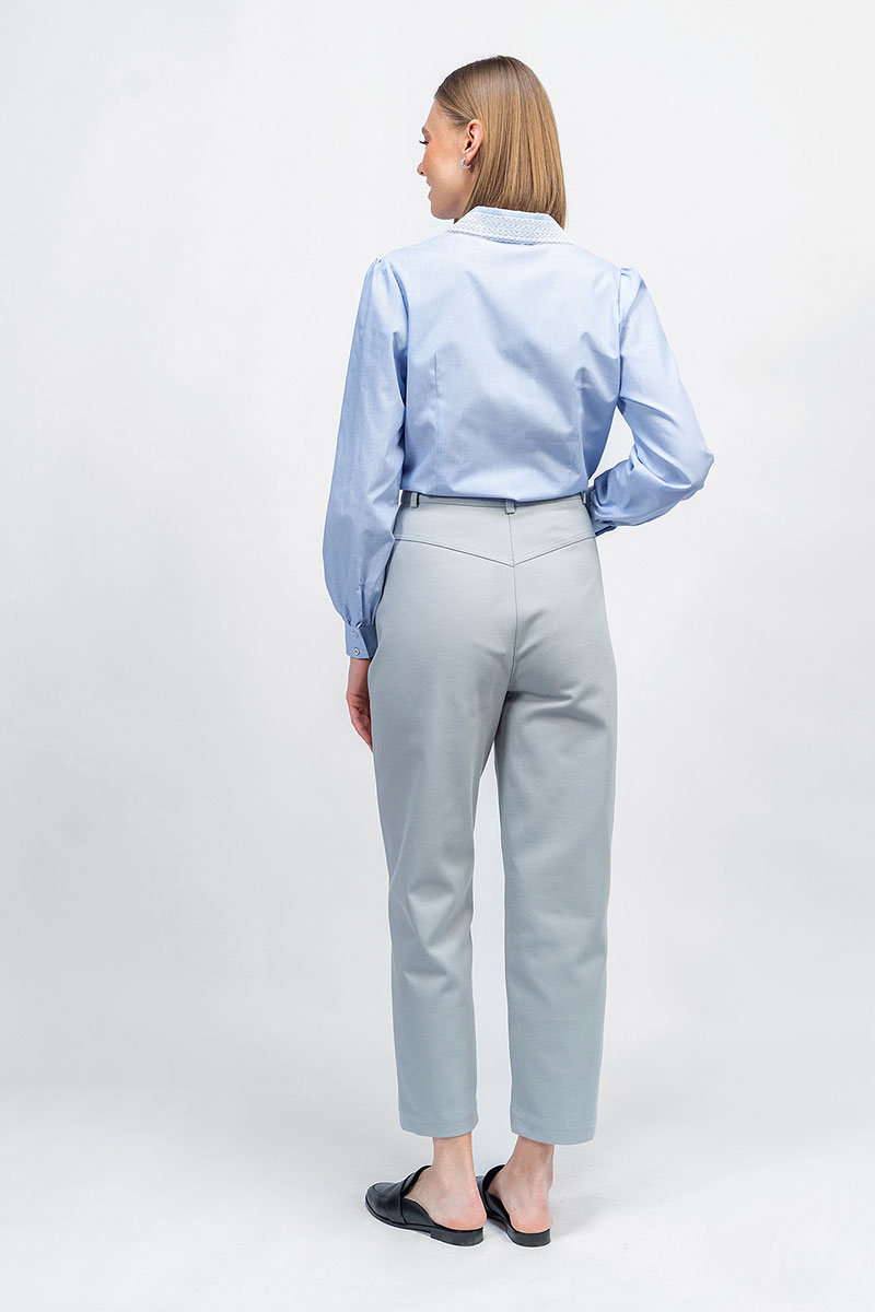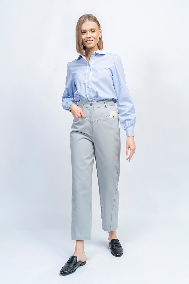 Универсальный комплект подойдёт для создания различных повседневных и деловых образов, состоит из стильной блузки с отделкой из изящного кружева и джинсвых брюк дизайнерского кроя.