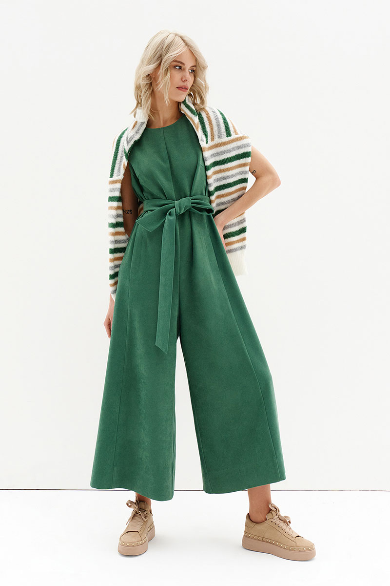 Стильный комбинезон лаконичного кроя с поясом, выполнен из плотного полотна на основе вискозы премиального качества.
