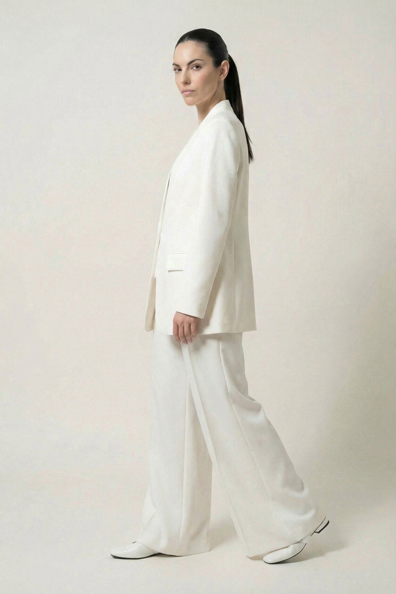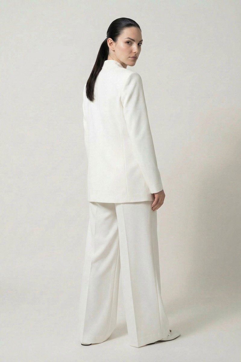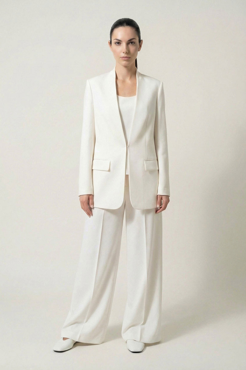 Жакет прямого силуэта из костюмной ткани, с застежкой на пришивной крючок, с воротником-стойкой по спинке, переходящим в V-образный вырез по переду. Перед с талиевой вытачкой, отрезным бочком, с прорезными карманами в рамку с клапаном. Рукав втачной двухшовный. Спинка с рельефами. Жакет на подкладке.
