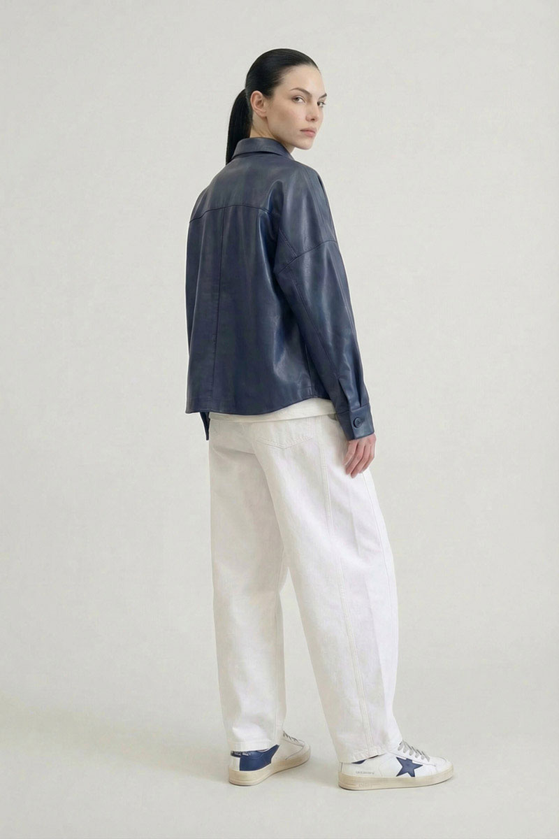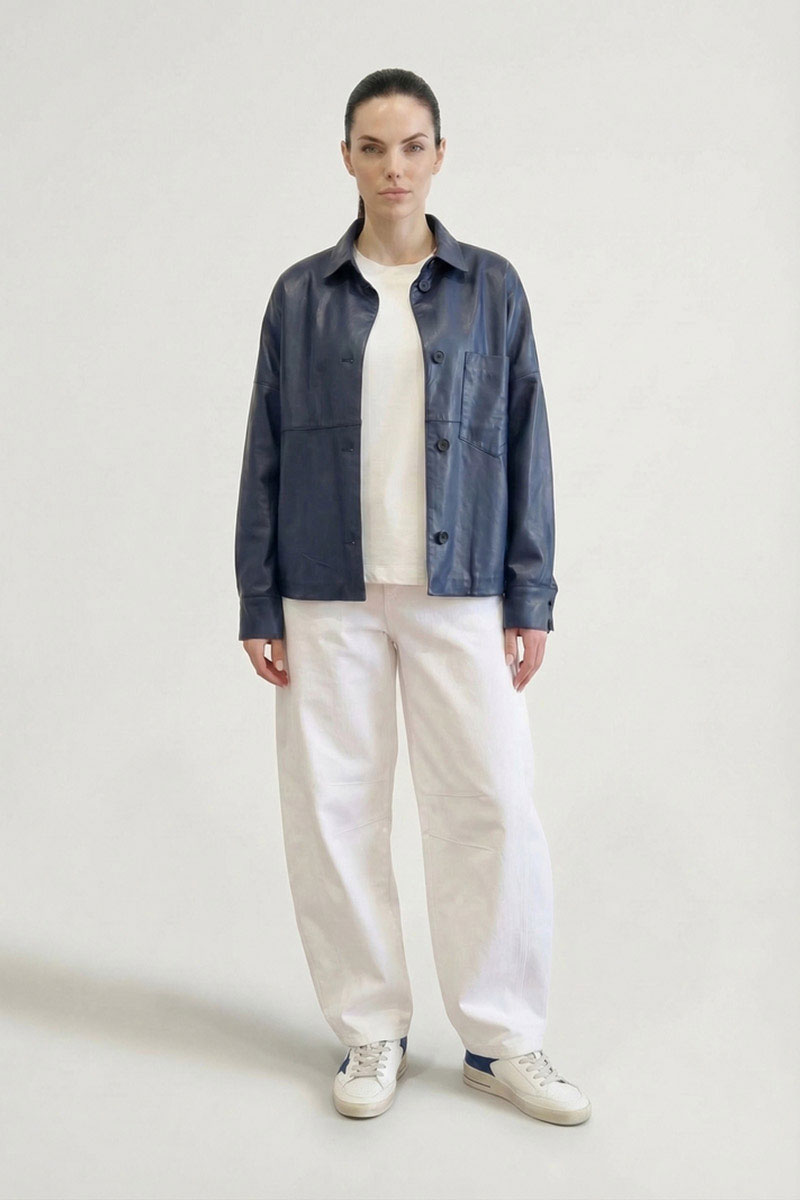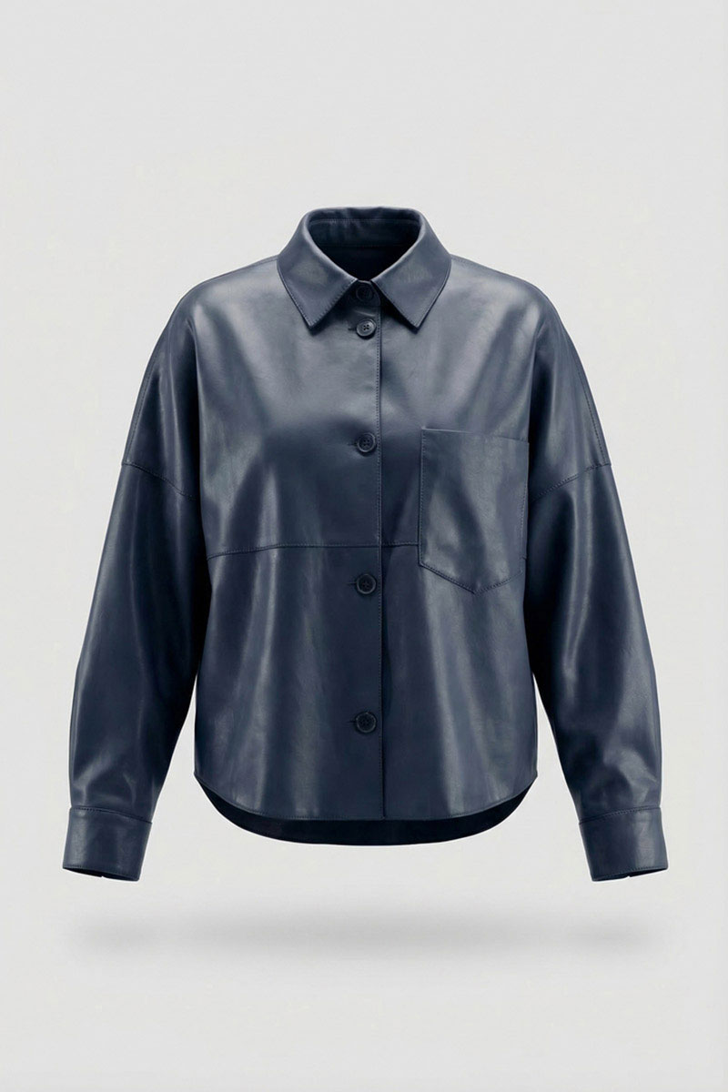 Жакет из экокожи в форме рубашки, на отлетной подкладке, со спущенной линией плеча, с рубашечным воротником на отрезной стойке. Перед с горизонтальным подрезом, на левой полочке с накладным карманом. Спинка с кокеткой и средним швом. Рукава с манжетами.