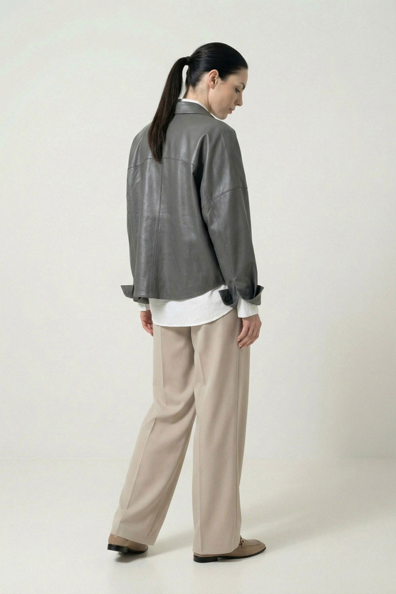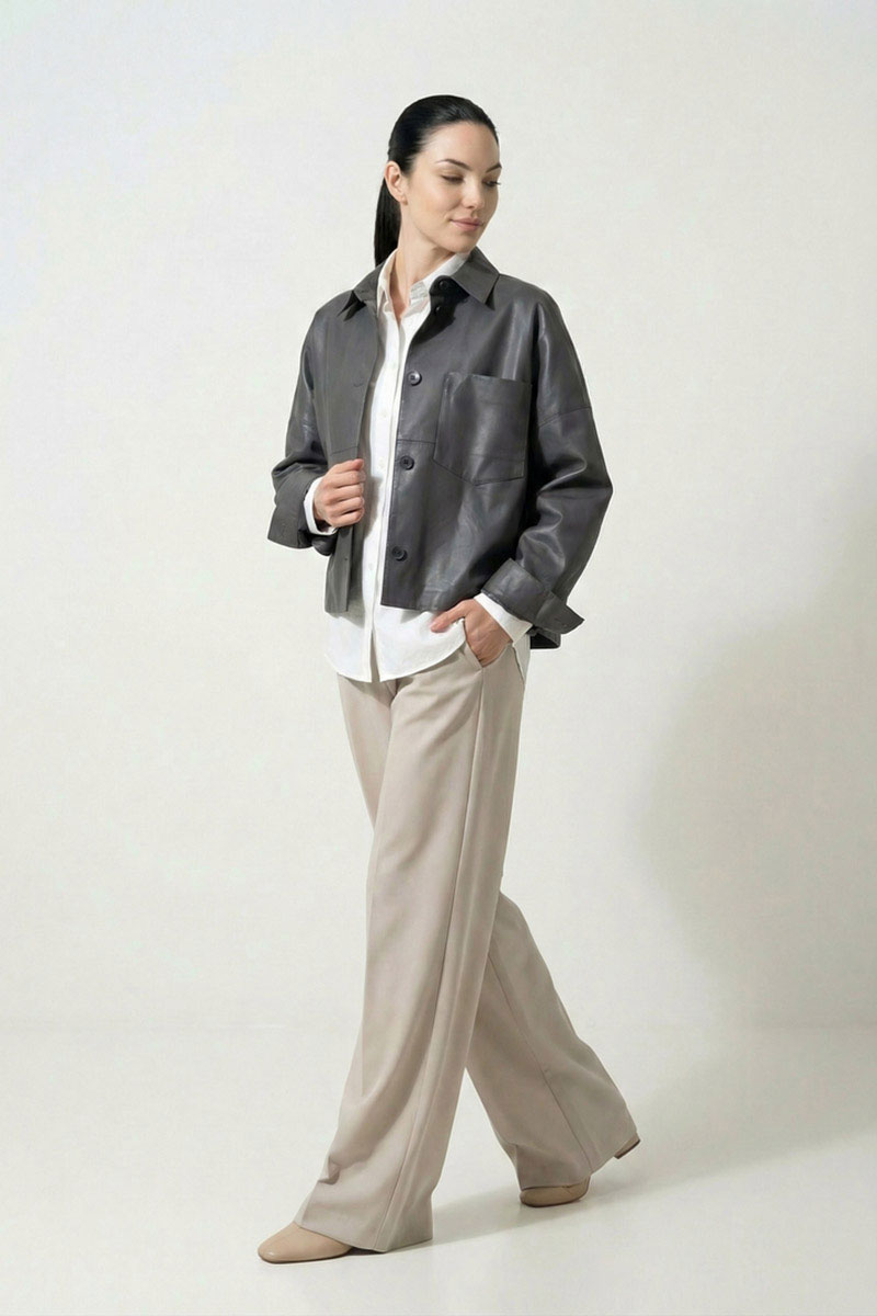 Жакет из экокожи в форме рубашки, на отлетной подкладке, со спущенной линией плеча, с рубашечным воротником на отрезной стойке. Перед с горизонтальным подрезом, на левой полочке с накладным карманом. Спинка с кокеткой и средним швом. Рукава с манжетами.