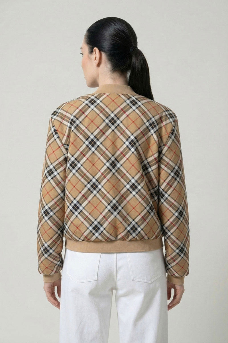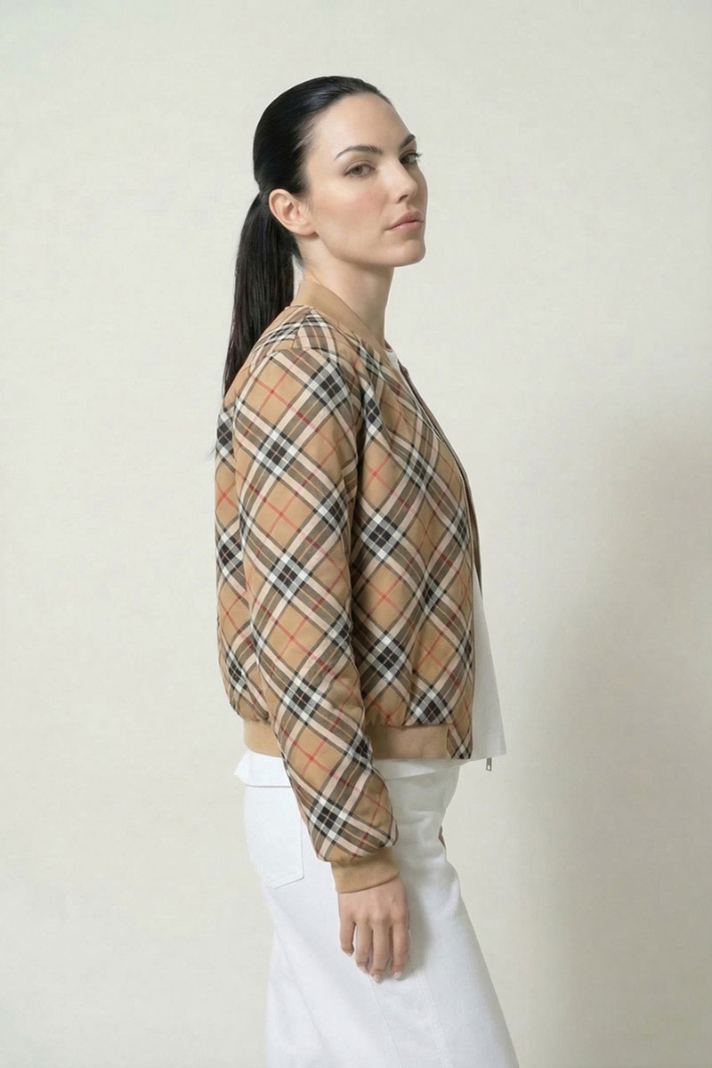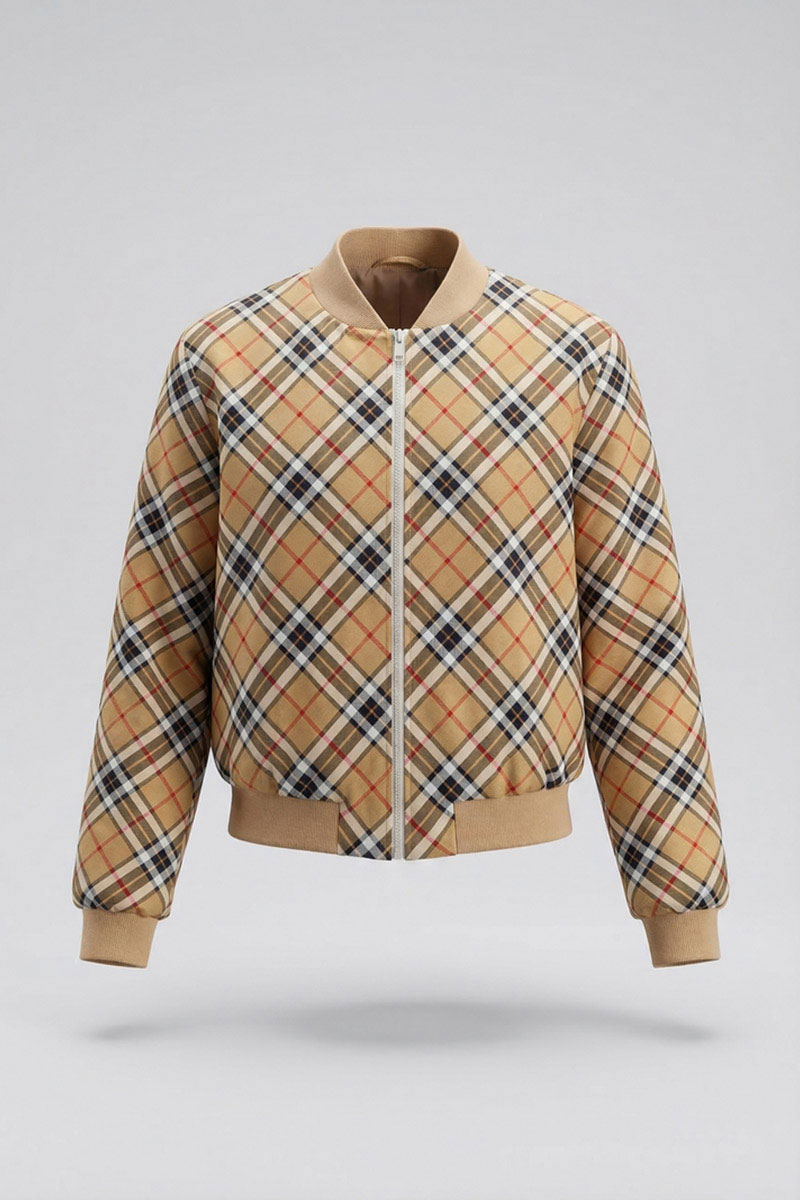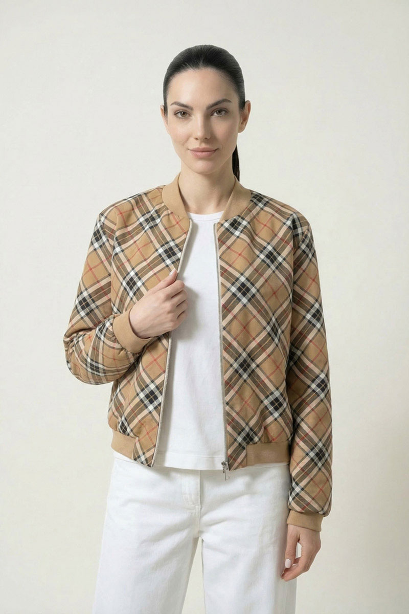 Жакет из трикотажного полотна на подкладке, с застежкой-молнией, с втачным рукавом, воротником-стойкой. Низ жакета, стойка воротника, манжеты выполнены из довяза. В подкладке на переде имеется накладной карман.