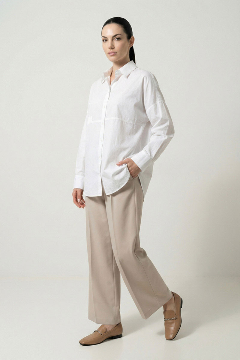 Рубашка из хлопковой ткани эффекта «крэш»,со спущенной линией плеча, с застежкой-планкой, с рубашечным воротником на отрезной стойке. Перед с подрезами, по правой части в подрезе отделочная листочка. Рукава с разрезами по локтевому шву, с притачными манжетами. Спинка со средним швом. По всем швам отделочная строчка.