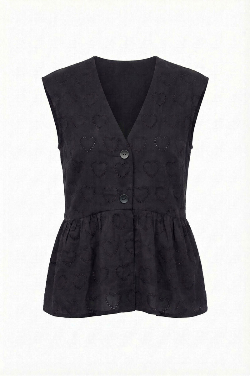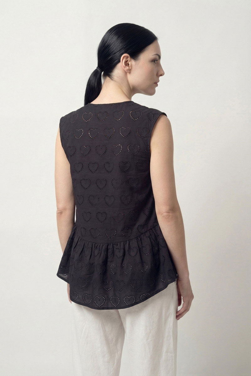 Блузка с отрезной фигурной баской, с застежкой на две пуговицы, слегка спущенным плечом. Баска с небольшой сборкой.