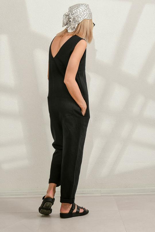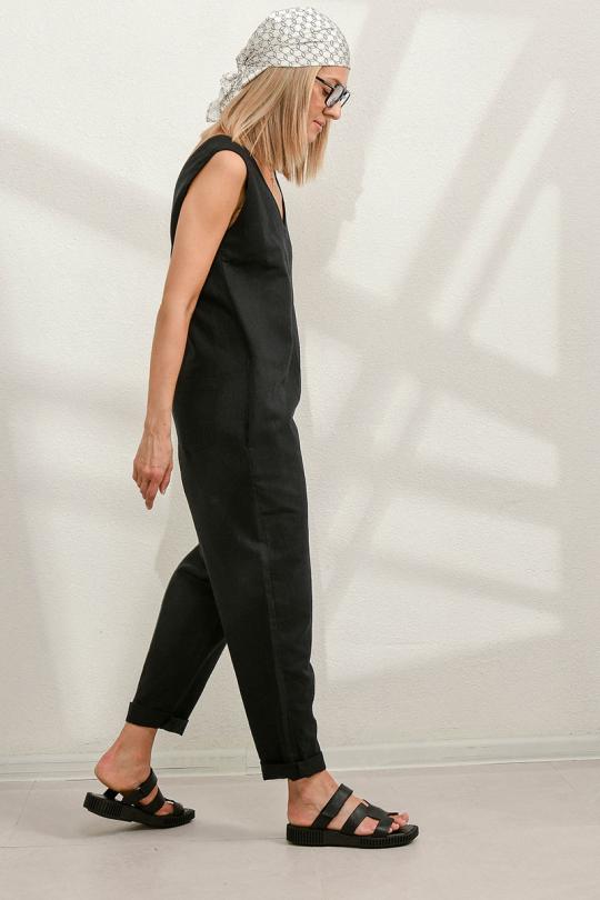 Льняной комбинезон в черном цвете. Свободный и невероятно удобный. Такой комфортно носить и в городе, и на курорте, для особых случаев и на каждый день. Выполнен из мягкого, легкого и прочного белорусского льна высочайшего качества. Зауженные к низу брюки, боковые карманы. Вы можете подчеркнуть талию тонким поясом или оставить свободный силуэт.