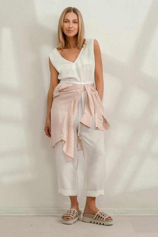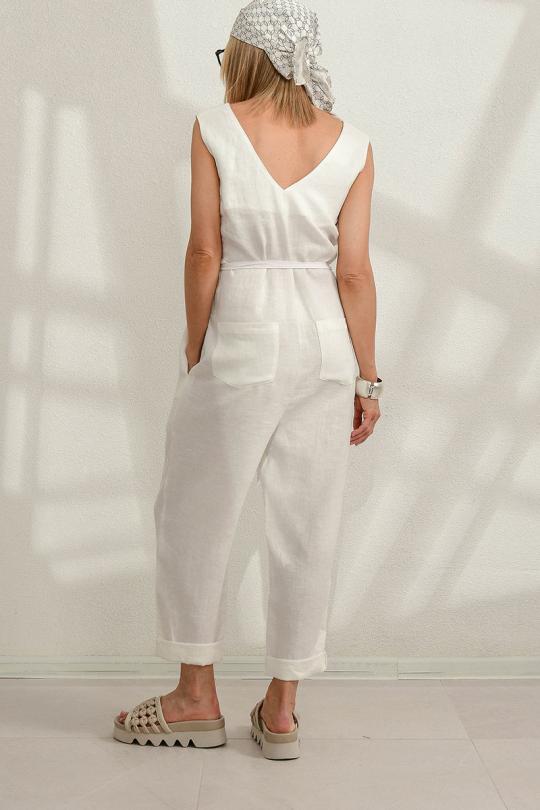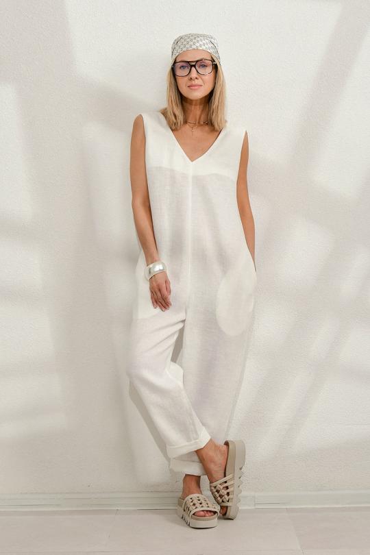 Льняной комбинезон в молочном оттенке. Свободный и невероятно удобный. Такой комфортно носить и в городе, и на курорте, для особых случаев и на каждый день. Выполнен из мягкого, легкого и прочного белорусского льна высочайшего качества. Зауженные к низу брюки, боковые карманы. Вы можете подчеркнуть талию тонким поясом или оставить свободный силуэт.