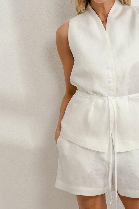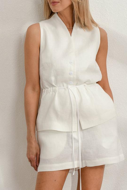 Льняные шорты в молочном оттенке. Выполнены из мягкого, легкого и прочного белорусского льна высочайшего качества. Эластичный пояс позволяет отрегулировать посадку, боковые карманы. Можно составить комплект с жилетом или брюками из нашей коллекции.