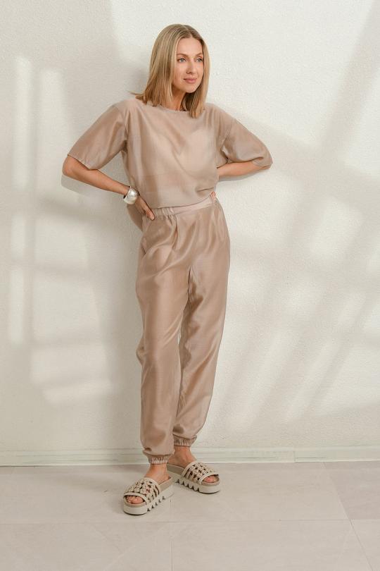 В брюках - эластичный пояс позволяет отрегулировать посадку. Собранны снизу на резинку. Защипы создают красивые складки.