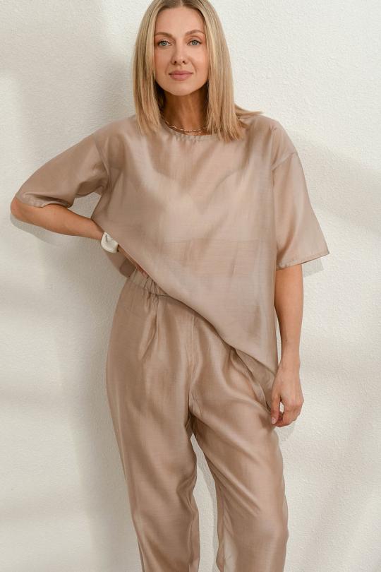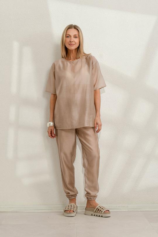 Комплект в бежевом оттенке. Для него мы выбрали воздушную и невероятно приятную к коже ткань, в составе которой хлопок и вискоза. Тонкий полупрозрачный материал с легким глянцем напоминает облачко, но хорошо держит форму.