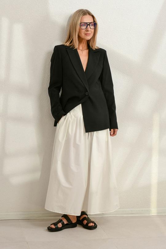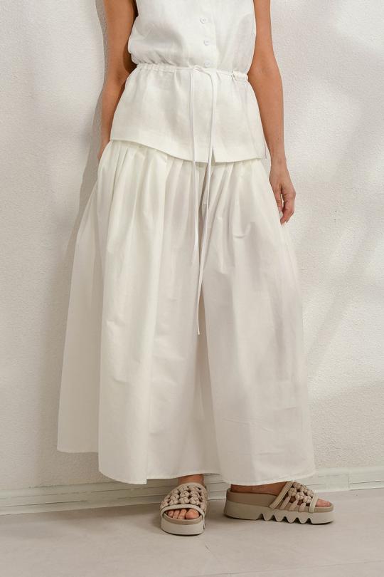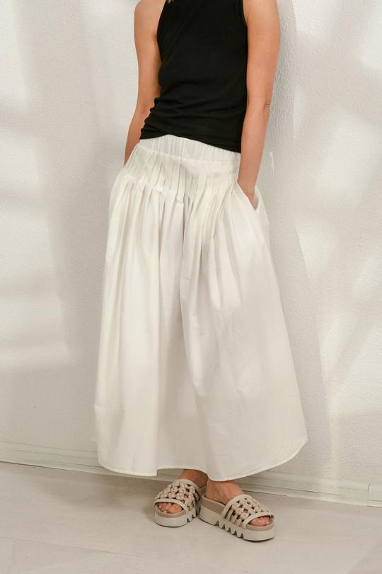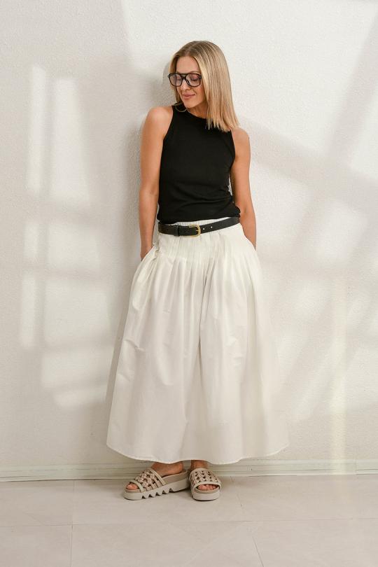 Свободная юбка с декоративными складками. Для нее мы выбрали приятный к коже, дышащий хлопок. Эластичный пояс на резинке, посадка ниже талии. Удобные боковые карманы. Такая модель будет хорошо сочетаться топами, майками или жилетами.