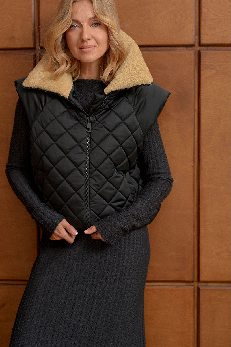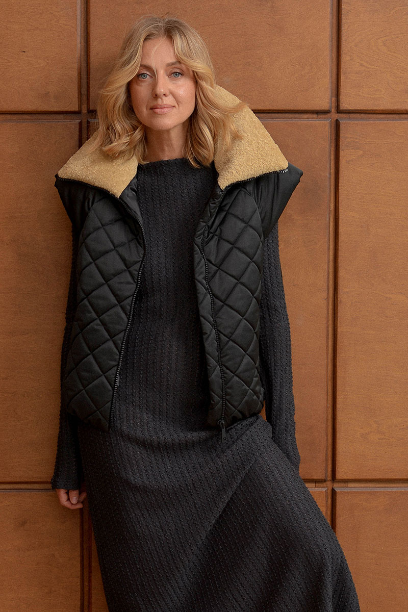 Утепленный стеганый жилет в черном цвете.Уютный округлый силуэт, высокий воротник с меховой вставкой из итальянской шерсти защищает от ветра и холода. Плотная, непромокаемая верхняя ткань ,подкладка из твила. Утеплитель Isosoft хорошо сохраняет тепло и благодаря стеганому материалу, не выглядит слишком объемным.Достаточно просторный, чтобы носить его на ваш любимый свитер или толстовку. Такая модель будет отлично сочетаться с джинсами, классическими брюками, юбкой или платьем.
