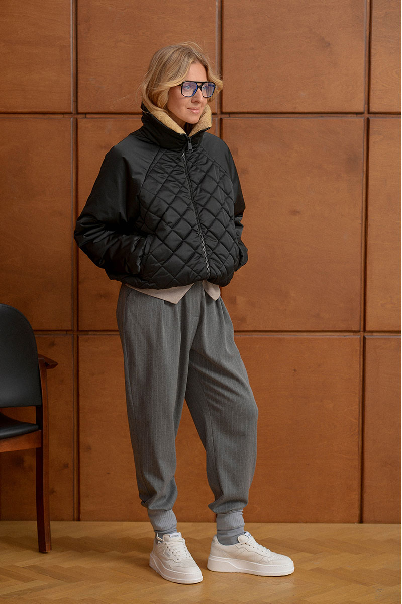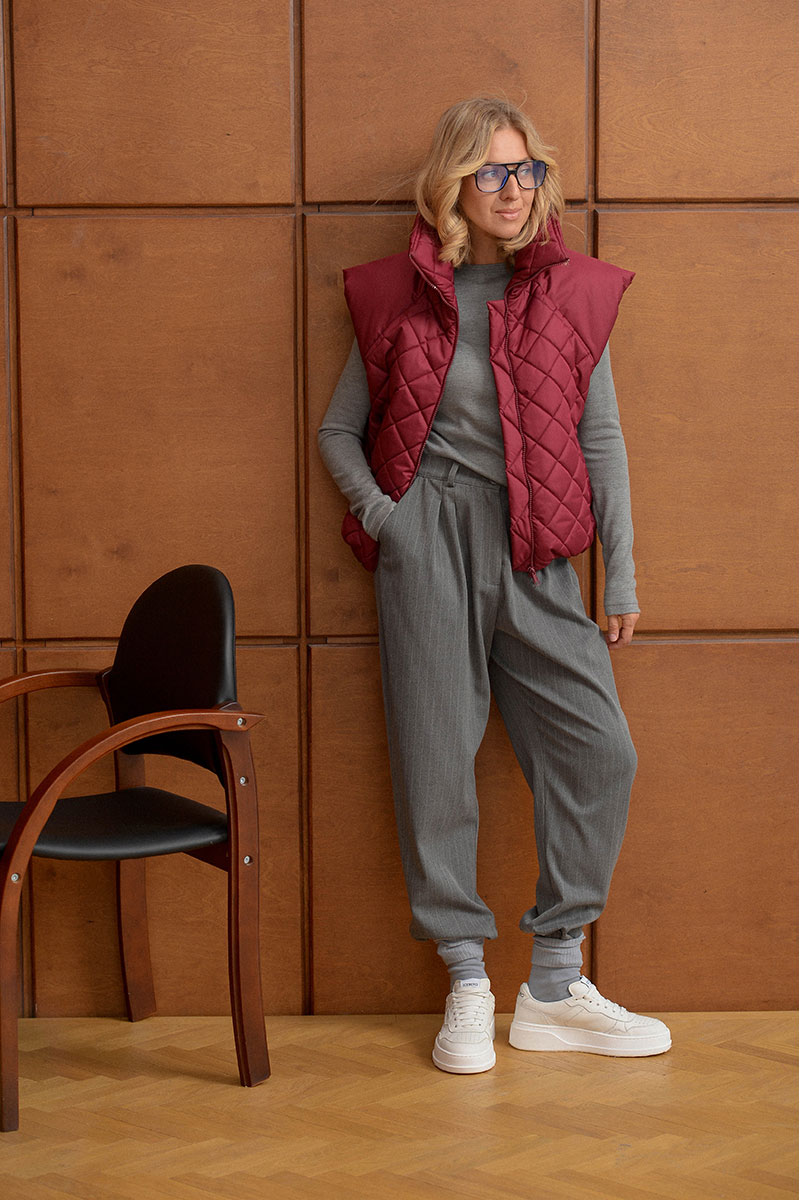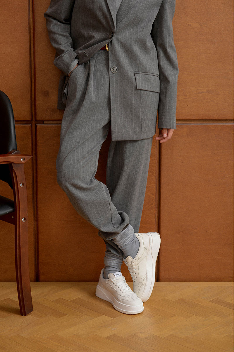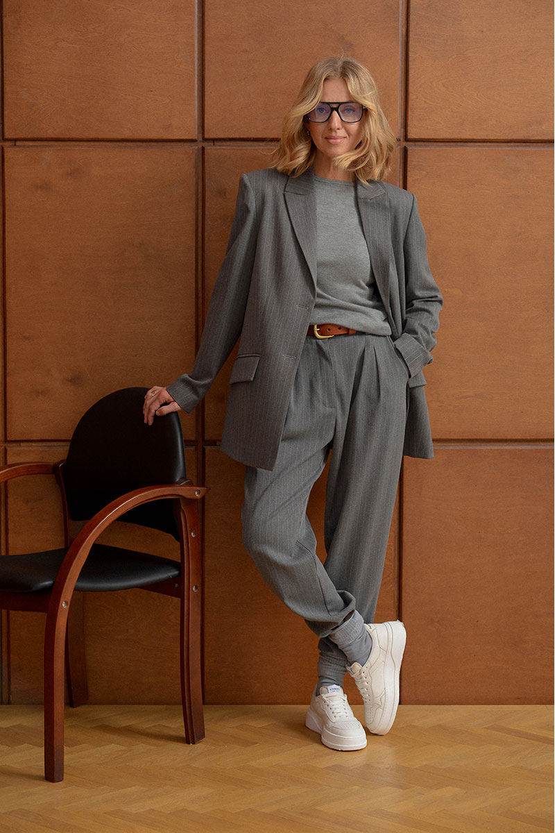 Брюки в полоску из итальянской шерсти. Свободный крой, эластичный пояс и боковые карманы делают изделие удобным и расслабленным, а защипы добавляют строгости и удлиняют силуэт. Свободный, зауженный к низу силуэт. Ткань отличается своей мягкой ворсистой изнанкой и текстурой. Посадка на талии. Идеально сочетаются с жакетом, стеганым жилетом и курткой из нашей коллекции.
