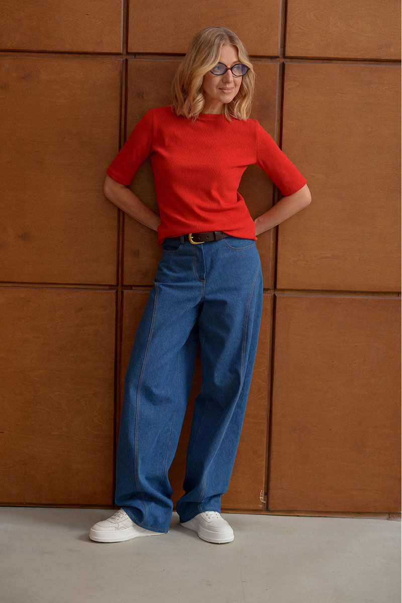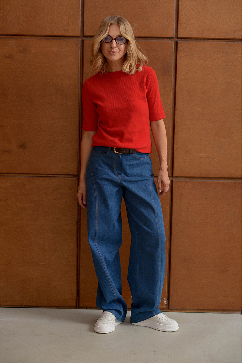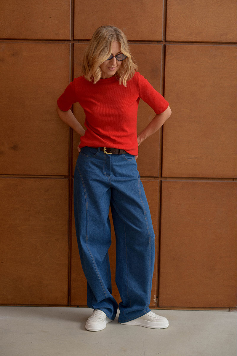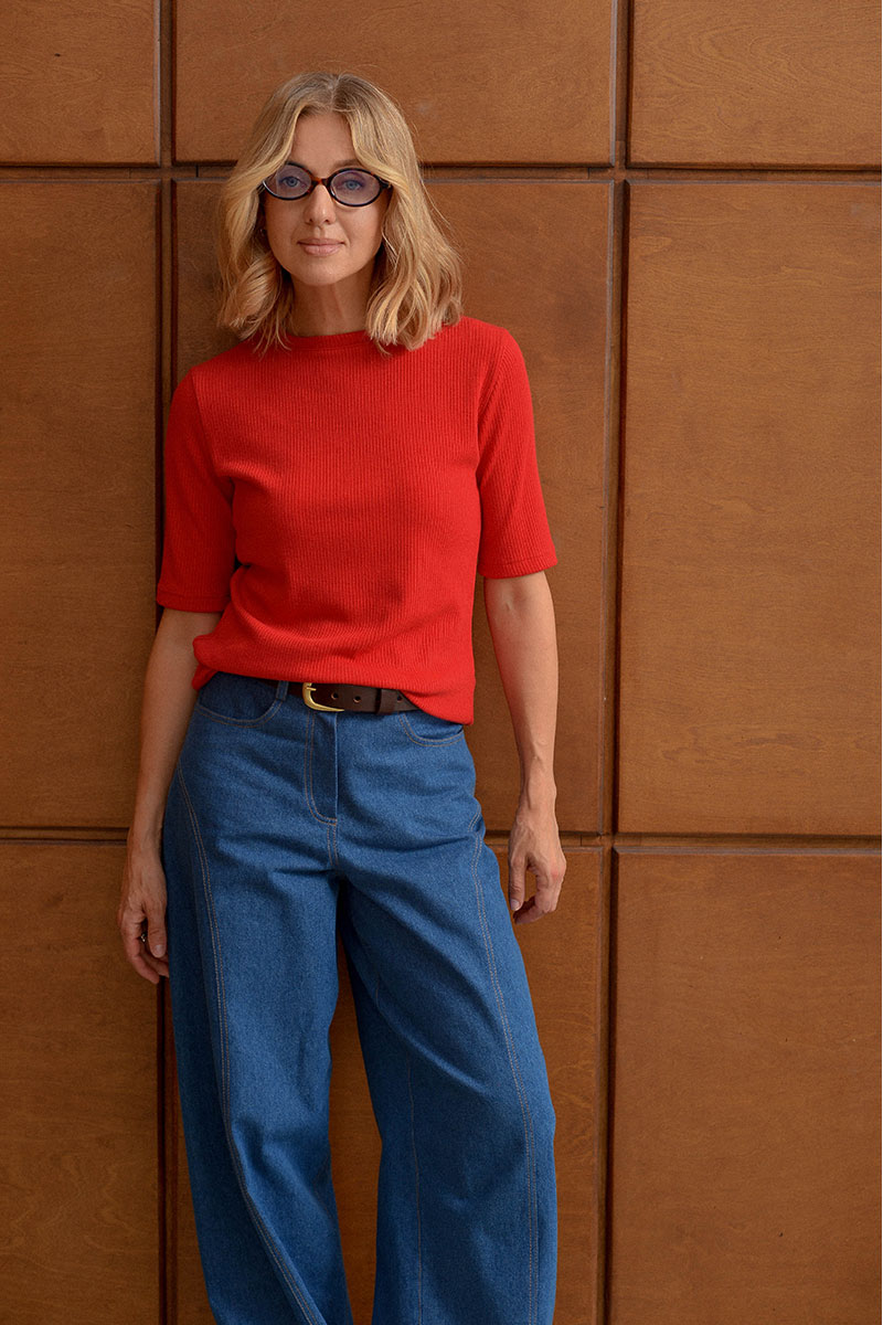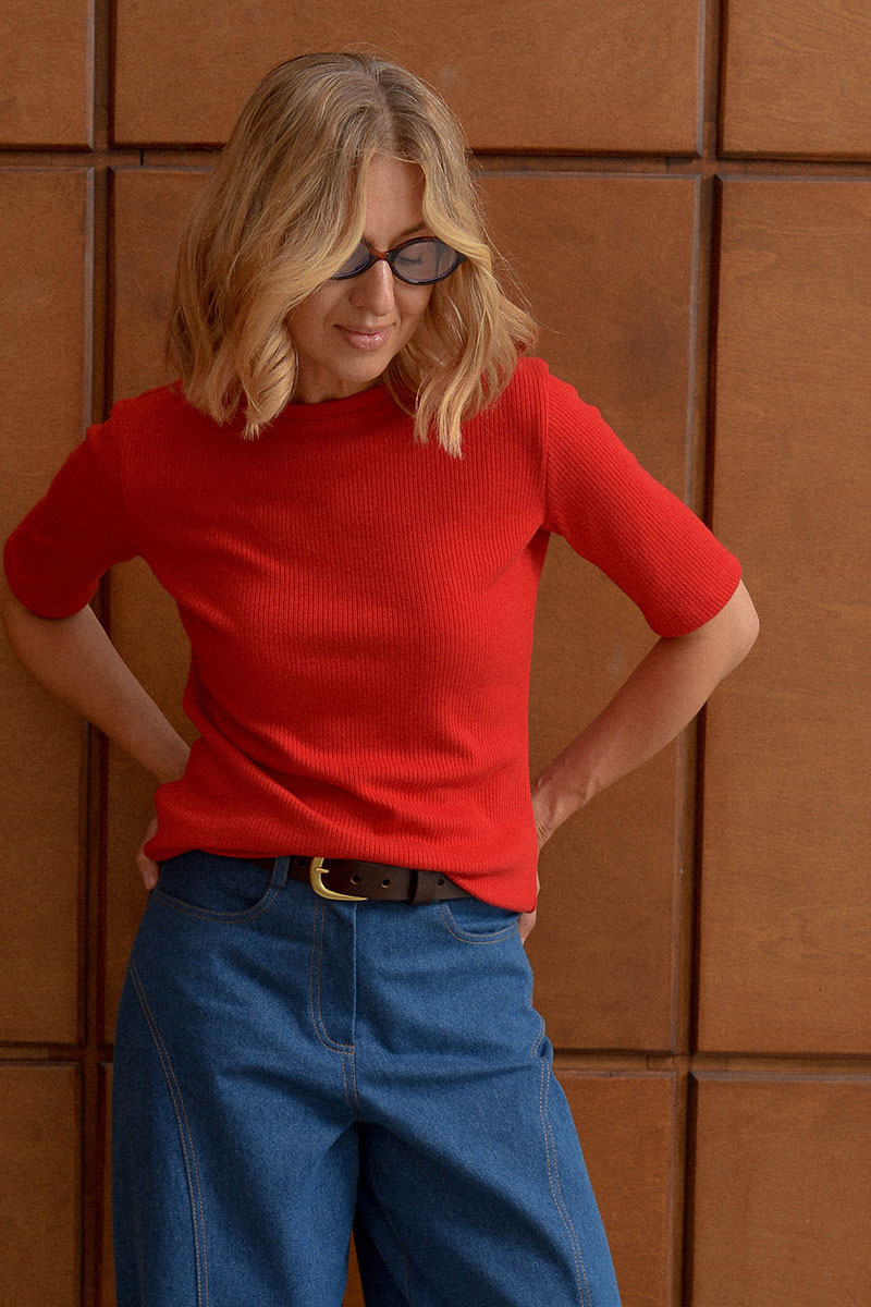 Джемпер в красивом красном оттенке. Мягкий трикотаж в рубчик. Расслабленный полуоблегающий силуэт - с рукавами до локтя, аккуратным вырезом. Его легко сочетать с другими вещами и приятно носить.