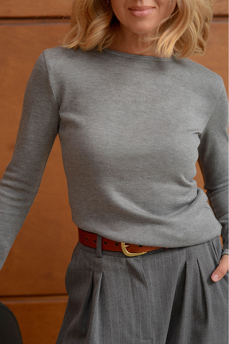 Лонгслив в сером оттенке. Выполнен из мягкой смесовой шерсти и вискозы, нежного и гладкого материала - почти не ощущается на теле.Классический круглый вырез, аккуратный полуприлегающий силуэт. Его удобно заправить в брюки или юбку и использовать как первый слой.