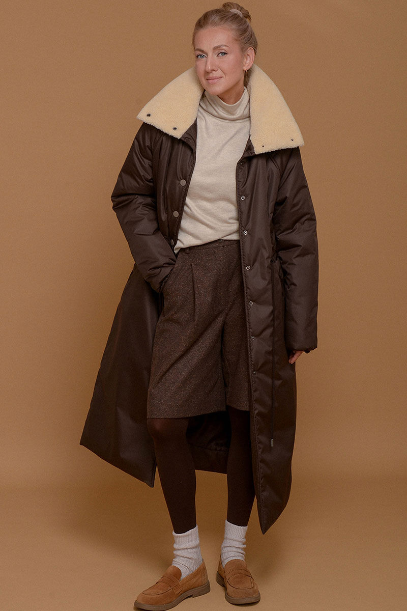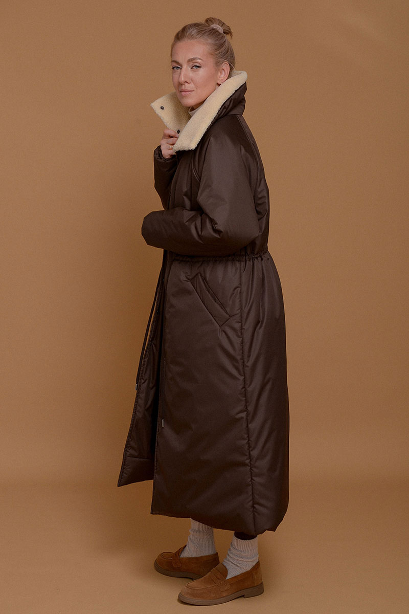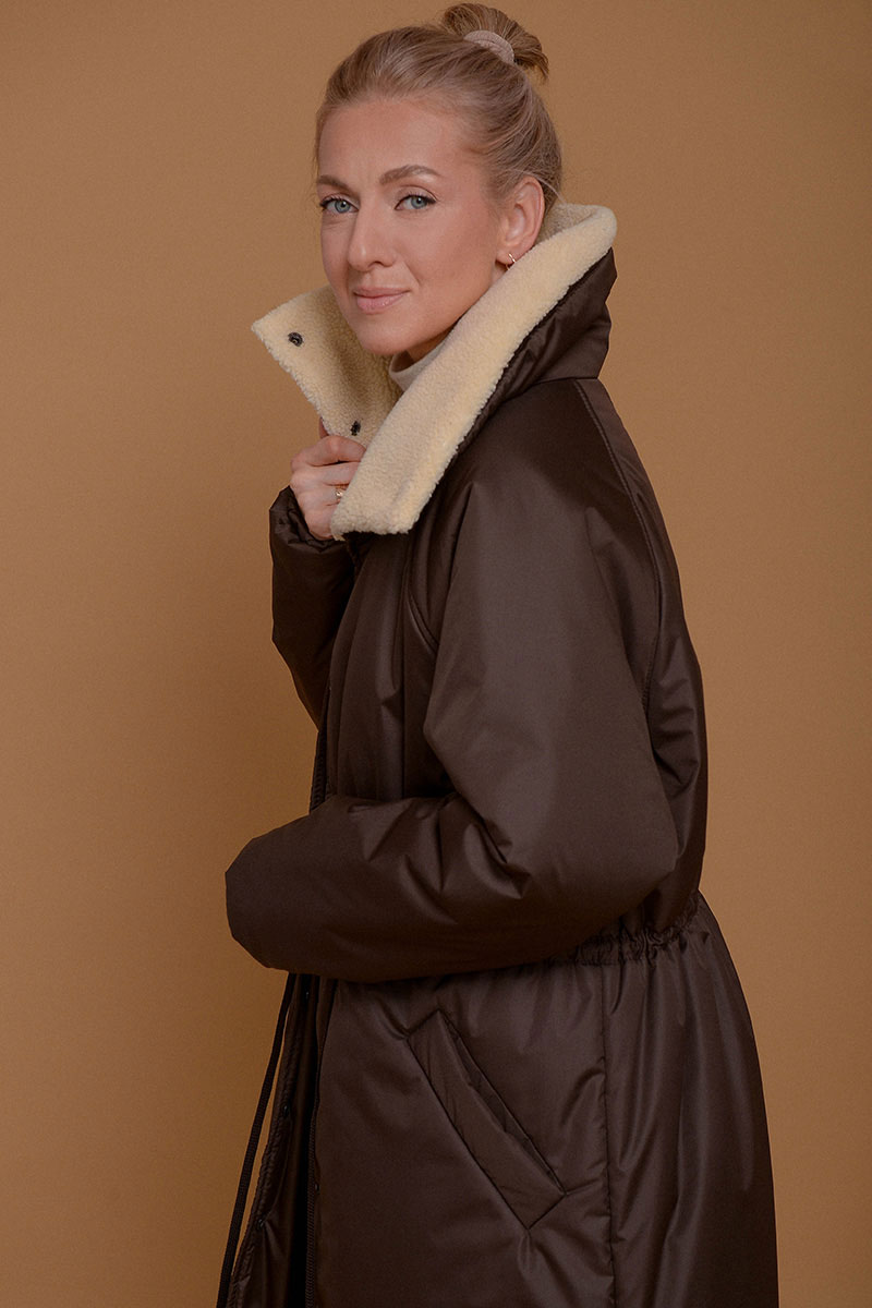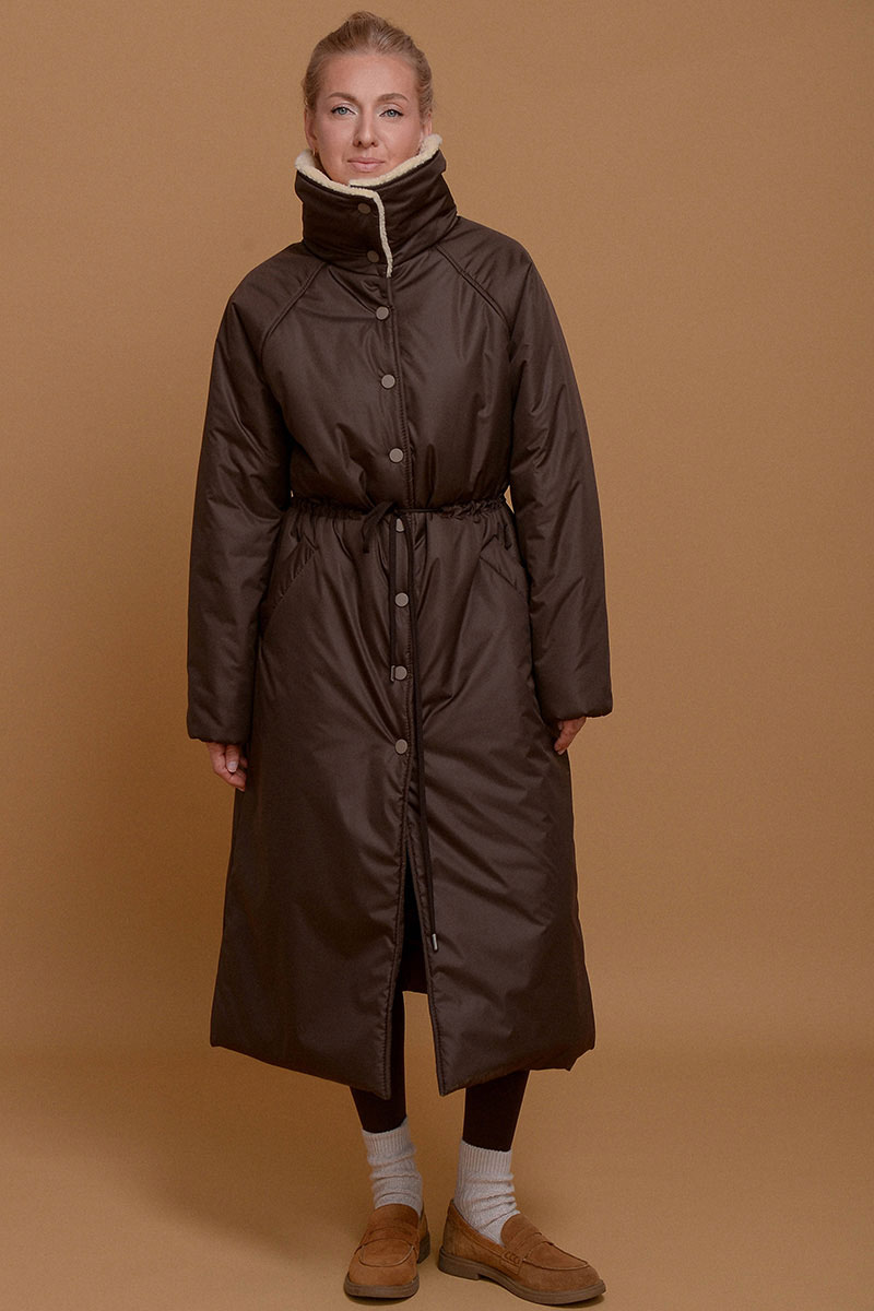 Невероятно легкое и одновременно теплое и уютное пальто в оттенке темного шоколада. С ним можно носить любимые платья даже в морозы. Плотная ткань не пропускает ветер и влагу, высокий воротник-стойка с мягким итальянским мехом и манжеты на резинке помогают сберечь тепло. С помощью кулиски на поясе можно сделать силуэт прямым или подчеркнуть талию. Утеплитель Isosoft хорошо сохраняет тепло и не утяжеляет изделие. Подкладочная ткань - из приятного к коже твила. Рукав реглан смягчает линию плеча и обеспечивает свободу движений. Застегивается на кнопки.