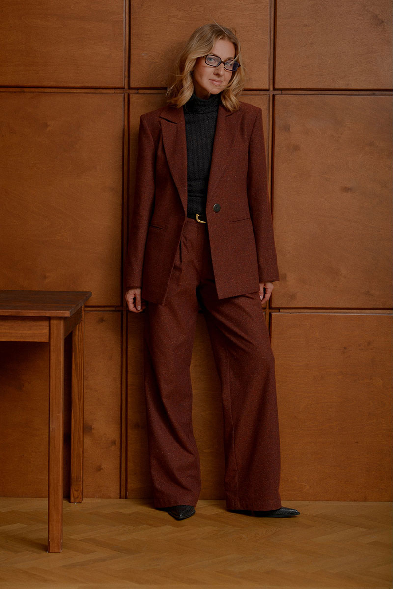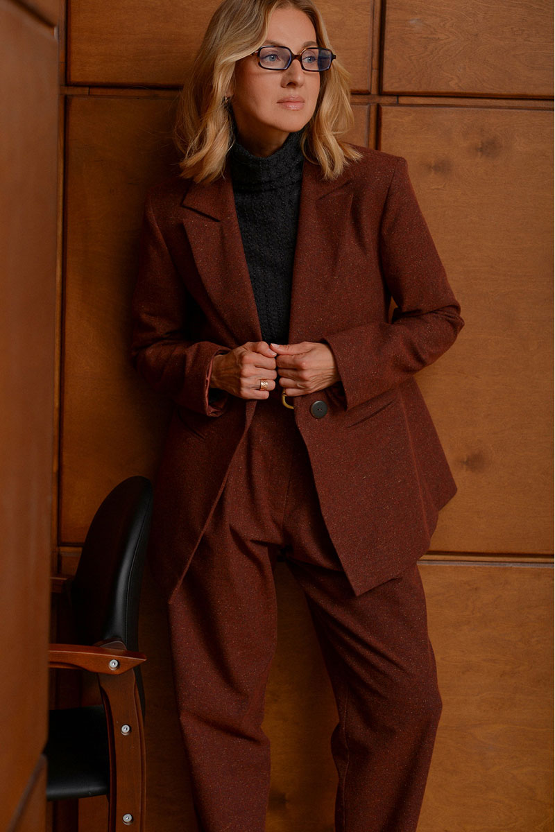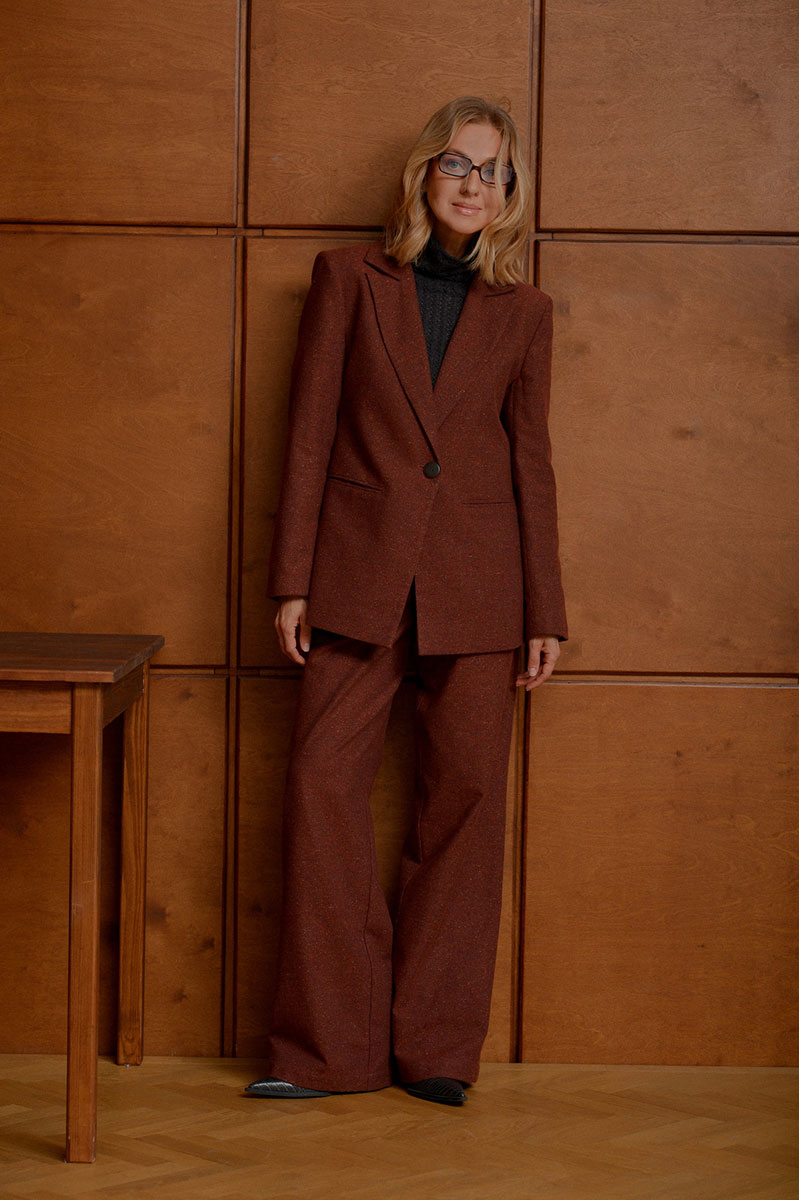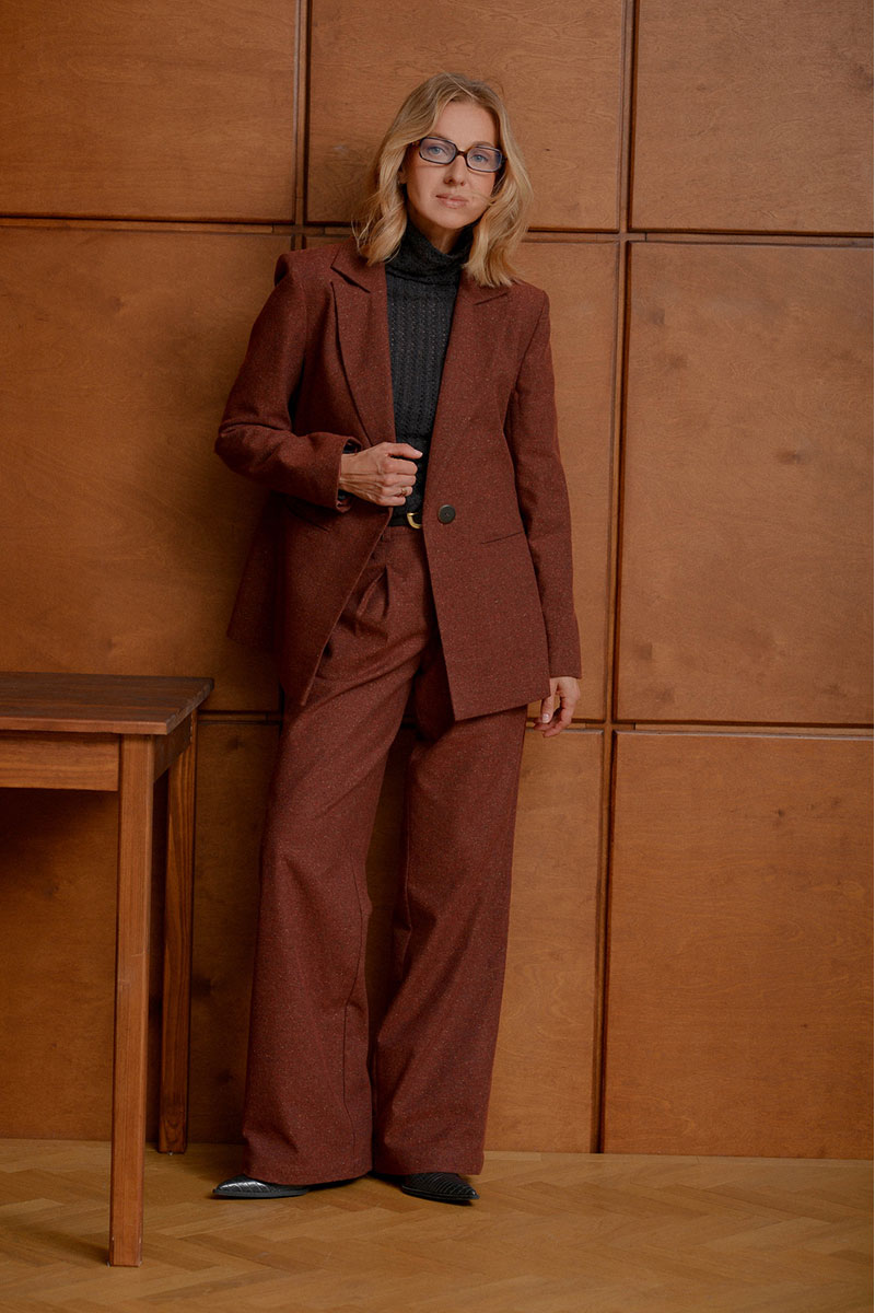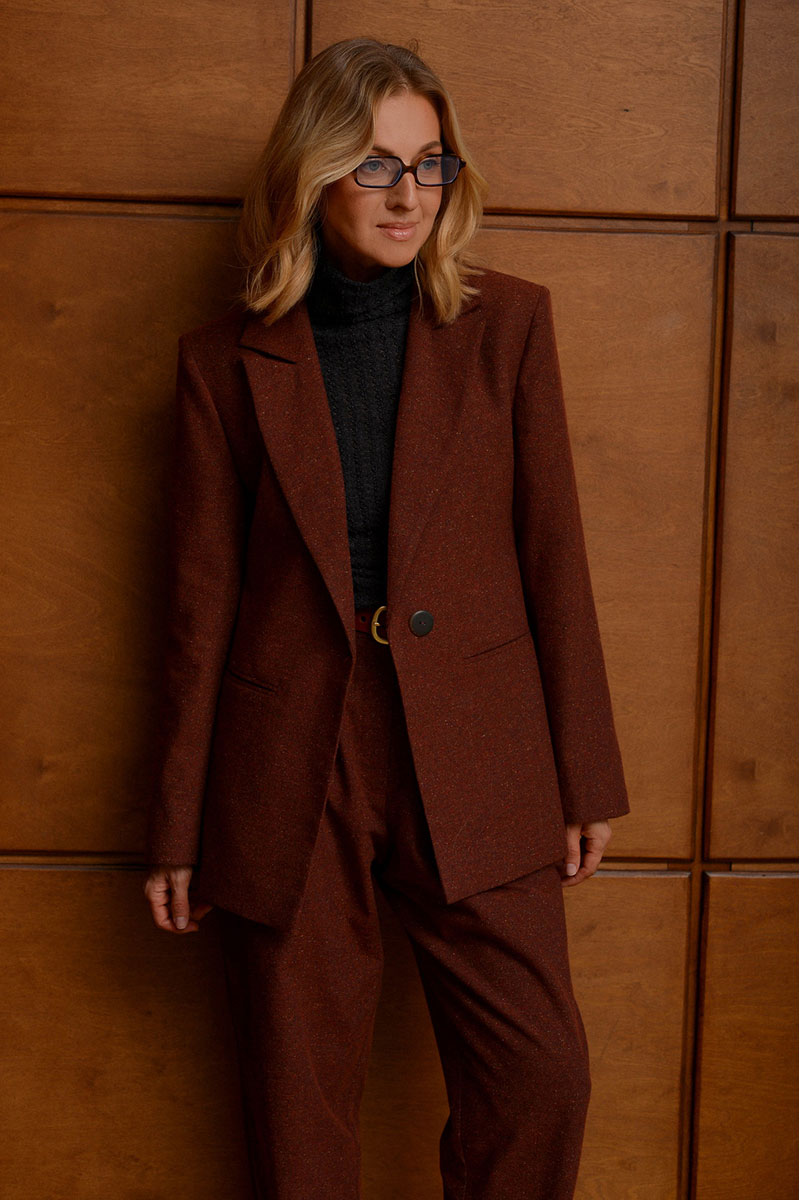 Жакет в терракотово-бордовом оттенке. Создан из премиальной итальянской шерсти с шелком. Ткань отличается своей мягкой ворсистой текстурой, отлично держит форму и сохраняет тепло. Формирует идеальный силуэт благодаря сочетанию плавных линий и акценту на талии, позволяет подчеркнуть фигуру. Благодаря комфортному подкладу из твила, изделие приятно ощущается на теле и удобно надевается поверх других вещей. Два прорезных кармана, застегивается на одну пуговицу. Идеально сочетается с костюмными брюками из нашей коллекции.