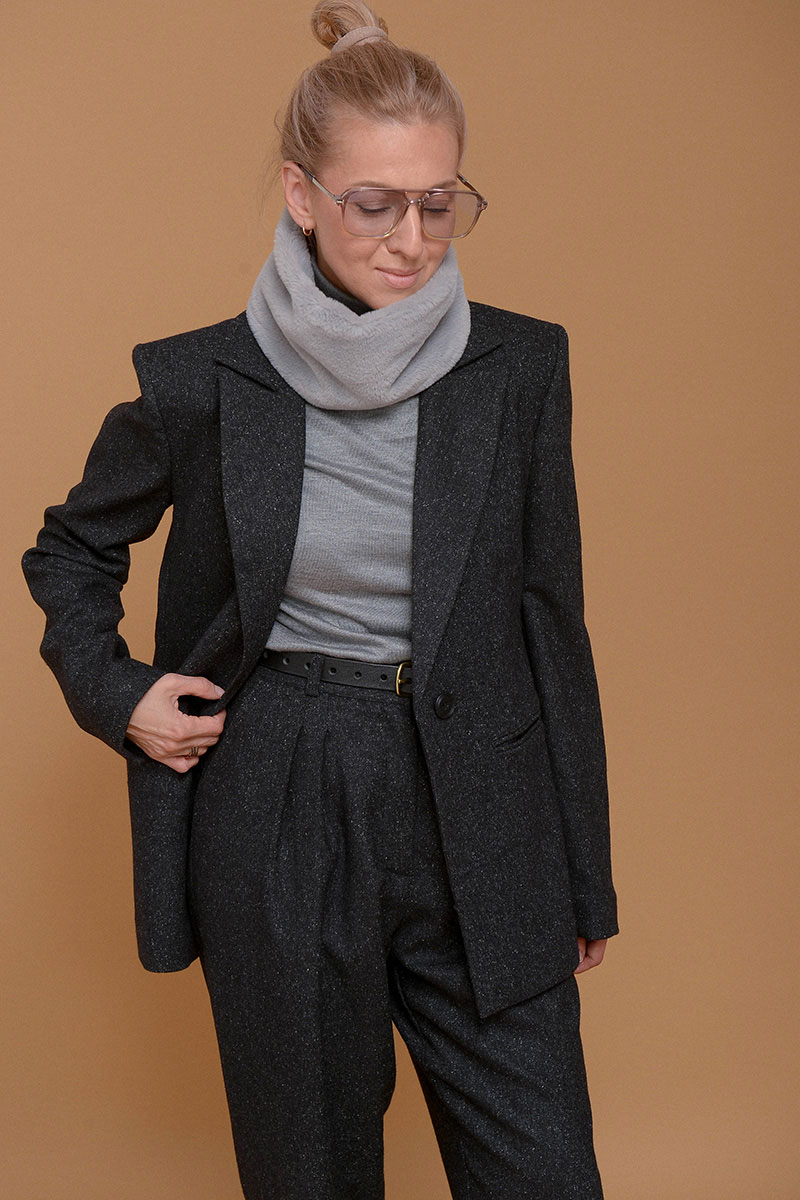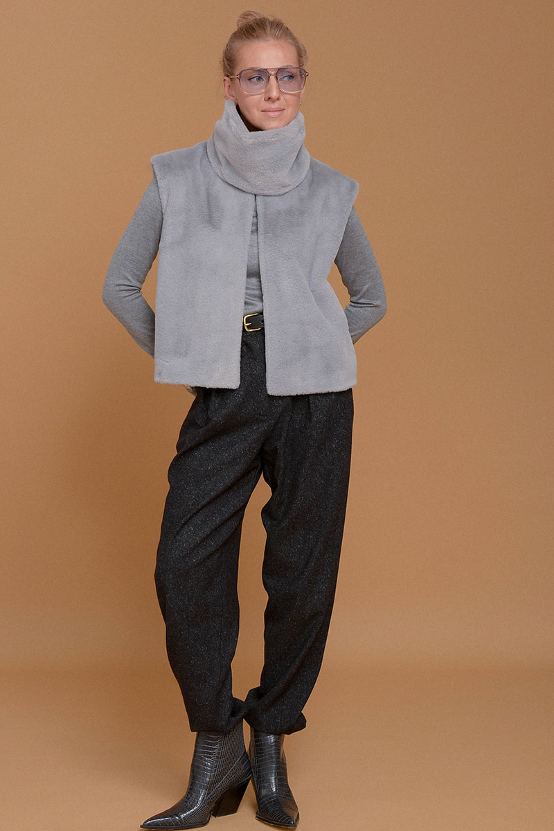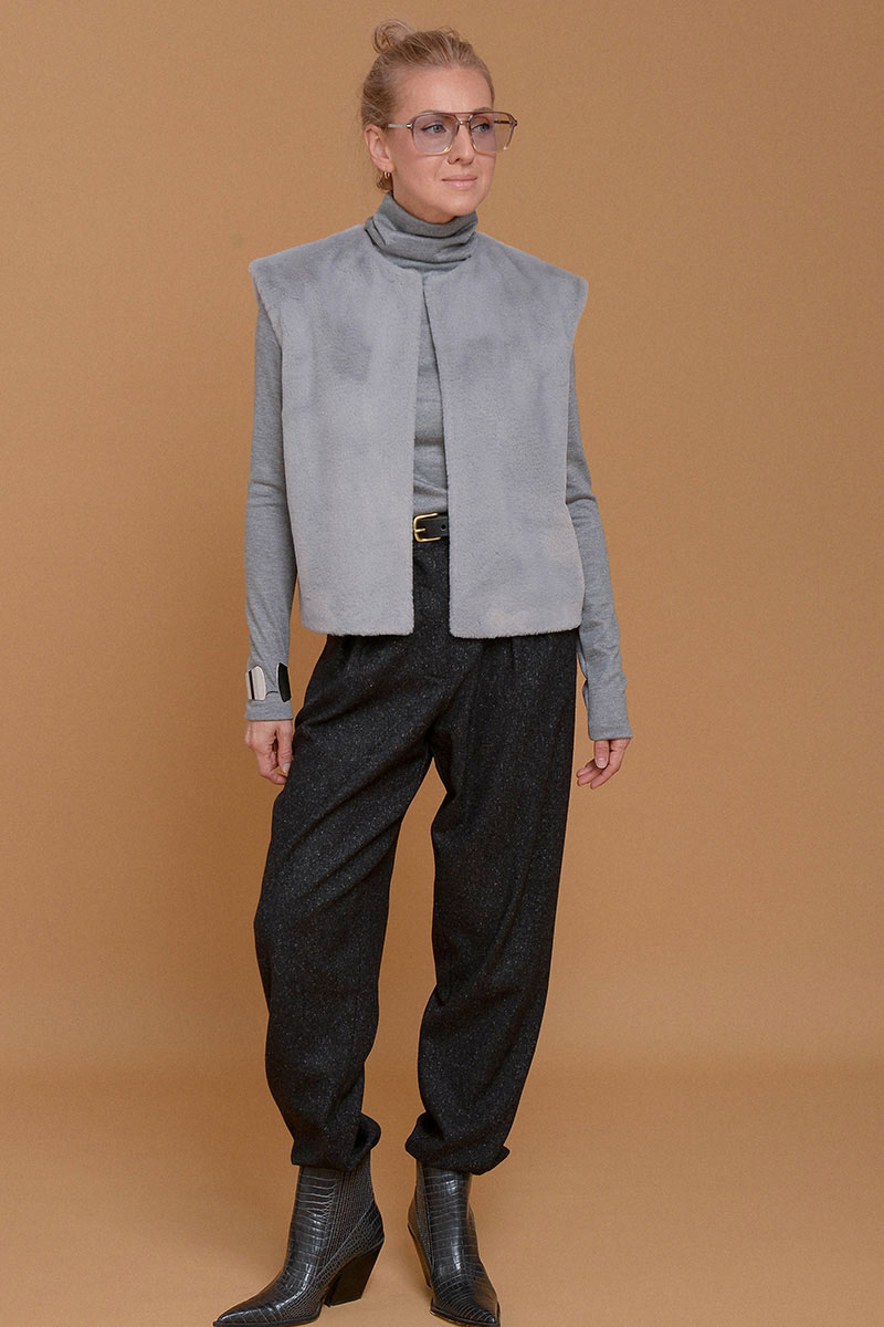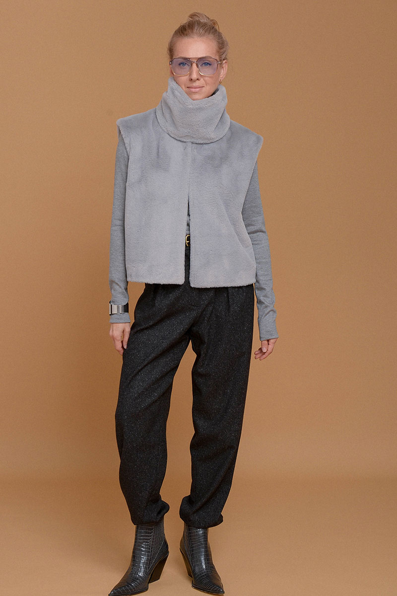 Жилет из итальянского экомеха с высоким воротником. Уютный и унверсальный. Настолько нежный, что с ним не захочется расставаться. Высокий воротник можно носить отдельно от жилета в качестве стильной замены шарфа. Жилет дополнен приятной к коже подкладочной тканью из твила. Без застежки. Используйте жилет как дополнительный согревающий слой под пальто или куртку.