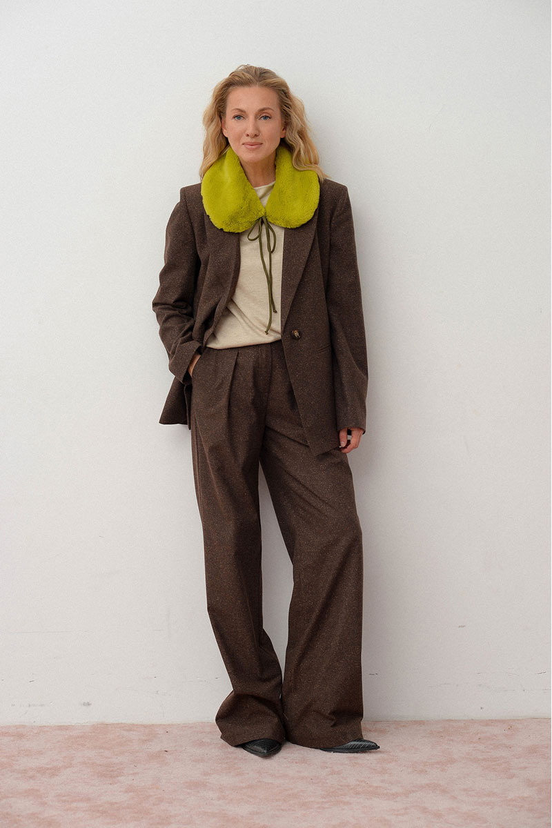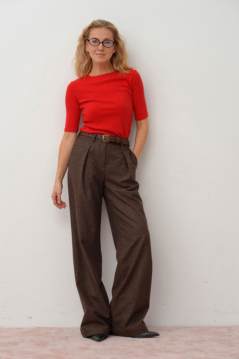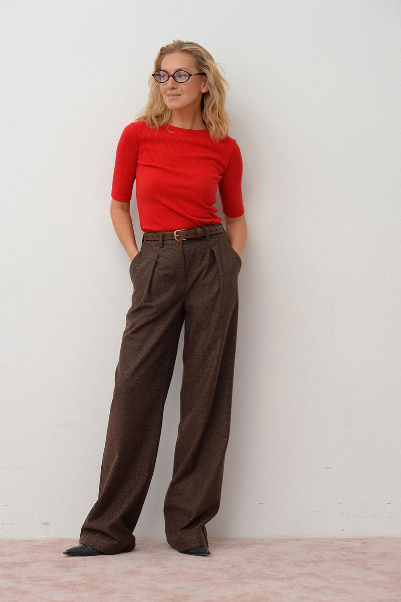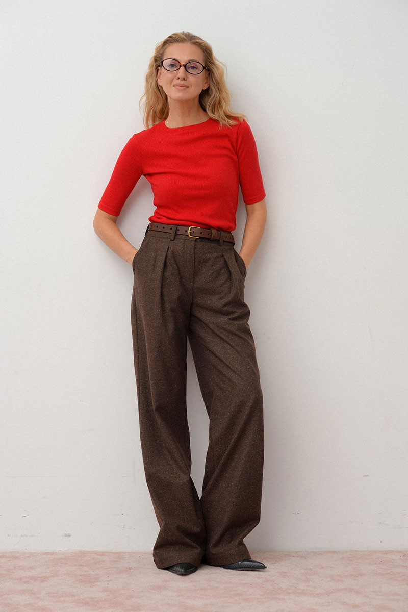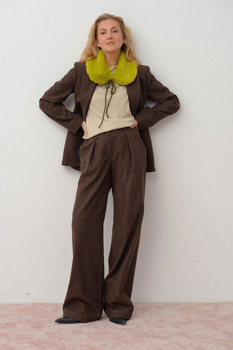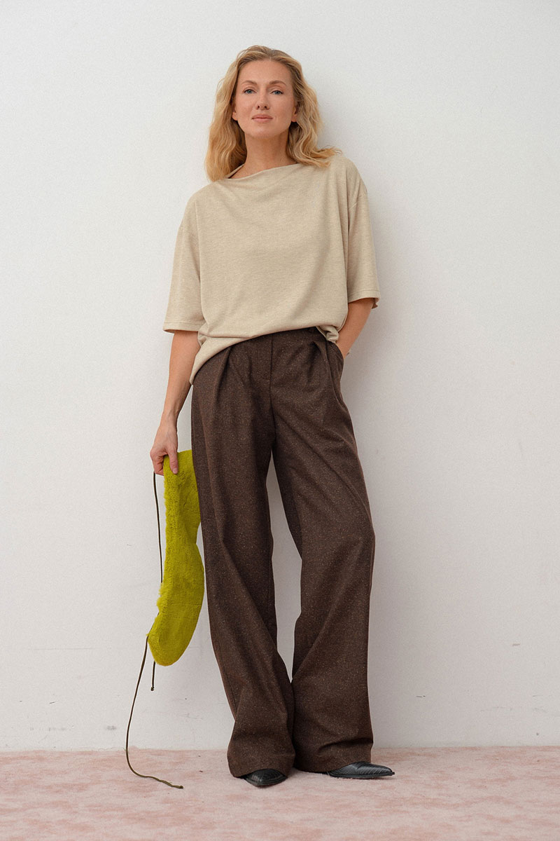Брюки из премиальной итальянской шерсти с шелком в меланжевом оттенке шоколада. Ткань отличается своей мягкой ворсистой текстурой, отлично сохраняет тепло. Брюки дополнены подкладочной тканью из комфортного к коже твила. Изящность изделия подчеркивается защипами, плавно переходящими в аккуратные складки вдоль брючин. Средняя посадка, эластичный пояс. Идеально сочетаются с жакетом из нашей коллекции.